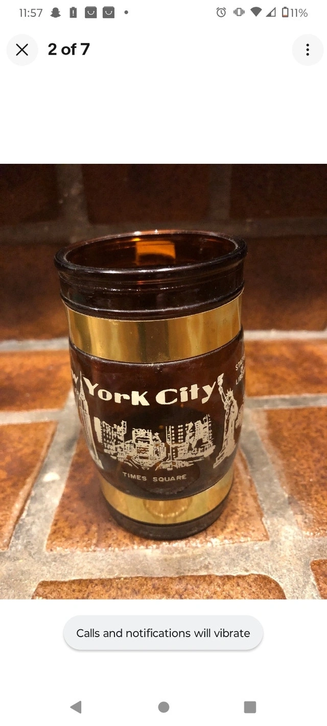 This vintage New York City souvenir shot glass features iconic landmarks like Times Square, the Empire State Building, and the Statue of Liberty, all in a stylish amber glass with gold trim. It's a great piece for collectors or anyone who loves NYC memorabilia! This shot glass is in used condition, but has been well cared for. If the ad's still up, the glass is still available!