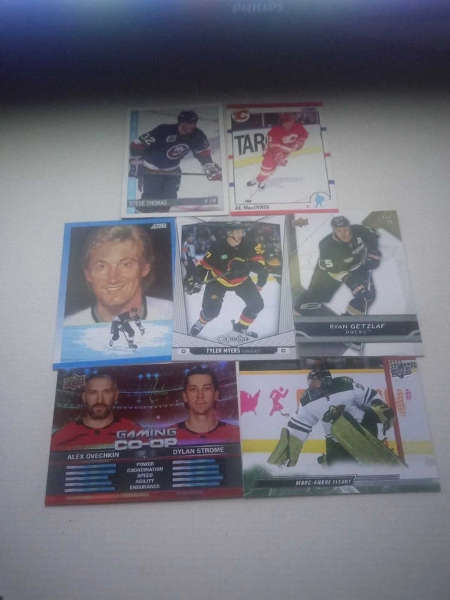 I'm offering a collection of used hockey cards featuring notable players such as Steve Thomas, Al MacInnis, Wayne Gretzky, Tyler Myers, Ryan Getzlaf, Alex Ovechkin, Dylan Strome, and Marc-Andre Fleury. The cards are in good condition, perfect for any hockey fan looking to expand their collection. Assorted years and brands. Various player stats and information on the back. Great for collecting or trading. If the ad's still up, the cards are still available!