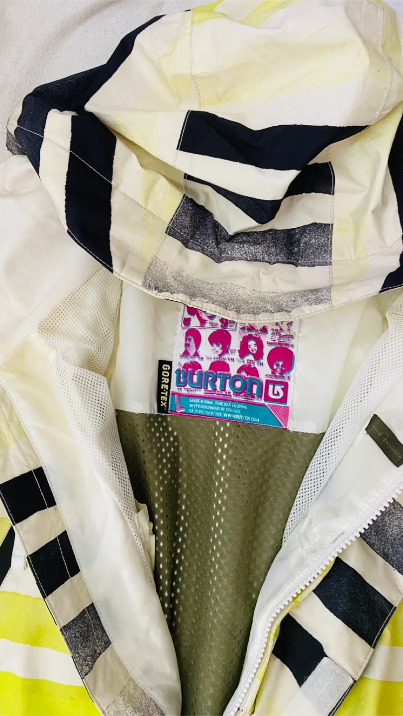 Selling a Burton Gore-Tex snowboard jacket. The jacket features a unique striped design in yellow, black, and grey. It is in good condition and perfect for hitting the slopes this winter! Size Large.