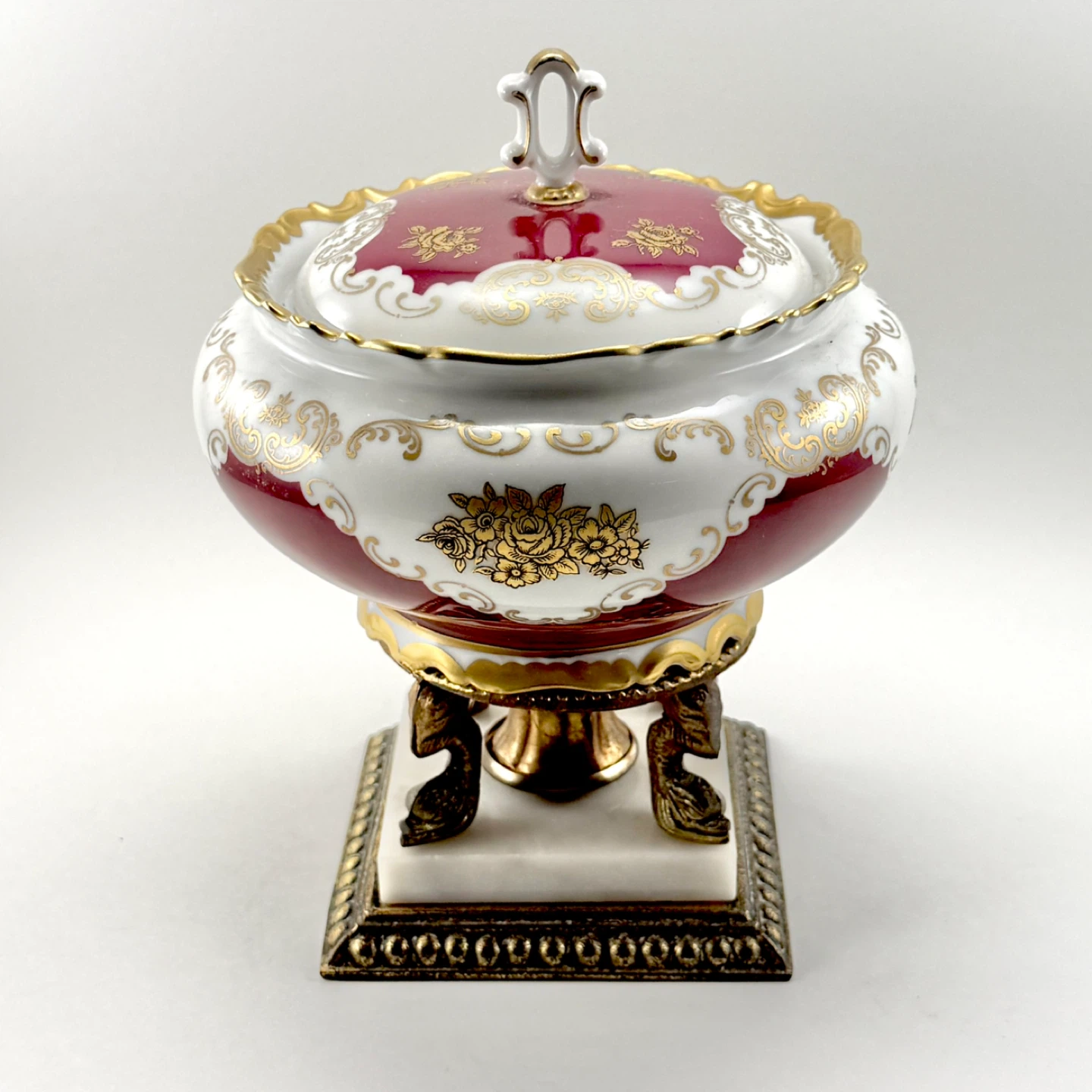 Beautiful fine porcelain lidded urn on brass renaissance dolphin feet. Stands approx 7” tall x 6” wide diameter. No chips, cracks or grazing. All good in tact. Great to store keys or other small items