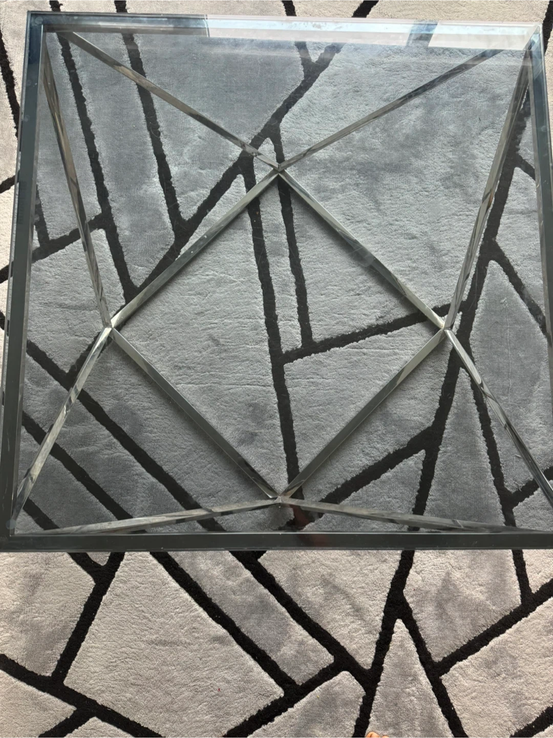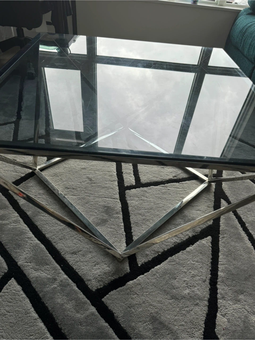 Selling a stylish coffee table with a glass top and a chrome base. It's in great condition and would look lovely in any living room!