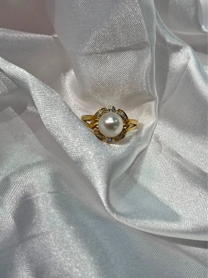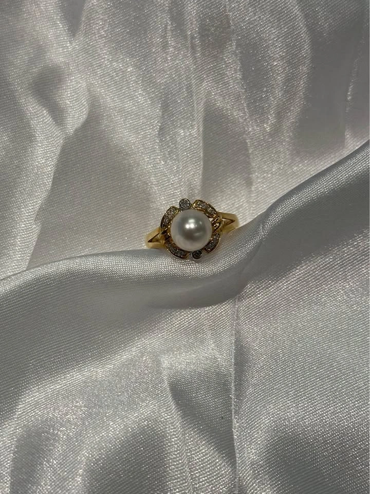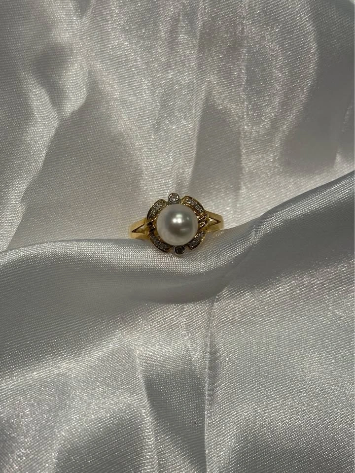 3.24g 18k solid gold ring with a natural Japanese pearl and diamonds. Size 6.5.