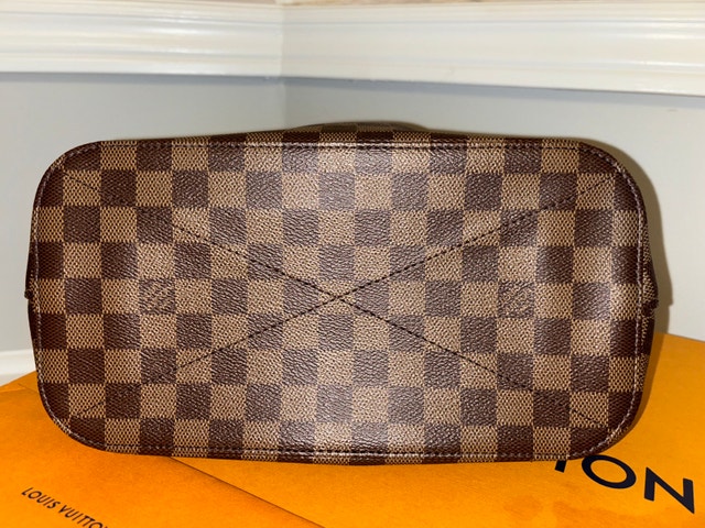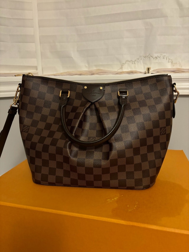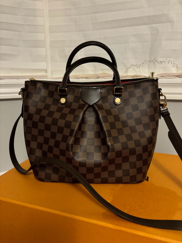 Louis Vuitton Damier Ebene Siena MM Features: Brown and Tan Damier Ebene Coated Canvas Brass Hardware Brown Leather Trim Dual Rolled Top Handles Single Detachable Flat Shoulder Strap with Buckle Adjustment Pleated Accent At Front Red Woven Interior Lining Three Slip Pockets at Interior Walls Zip Closure at Top Measurements: L 11" x H 9.5" x W 5.5" *brand new, perfume spilled on the box*