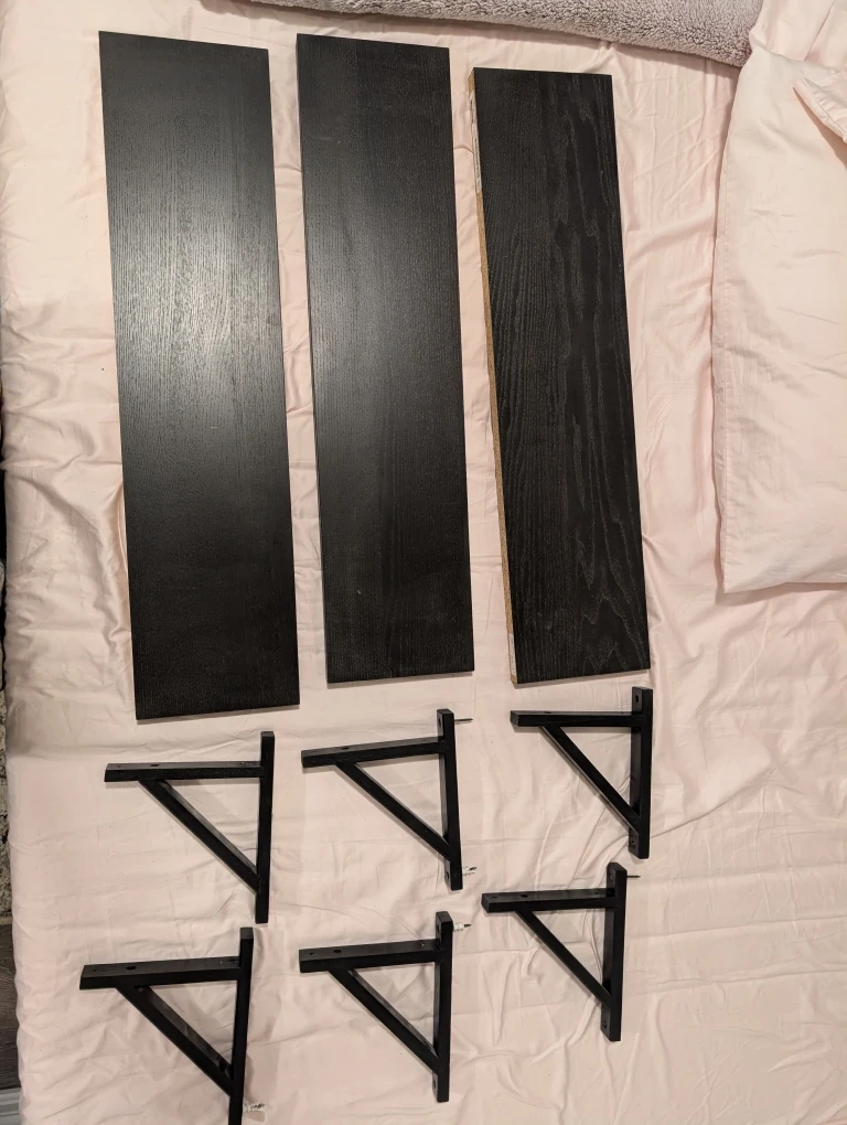 3 Black Ikea shelves (Ekby Jarpen) with 2 brackets (Ekby Valter) each