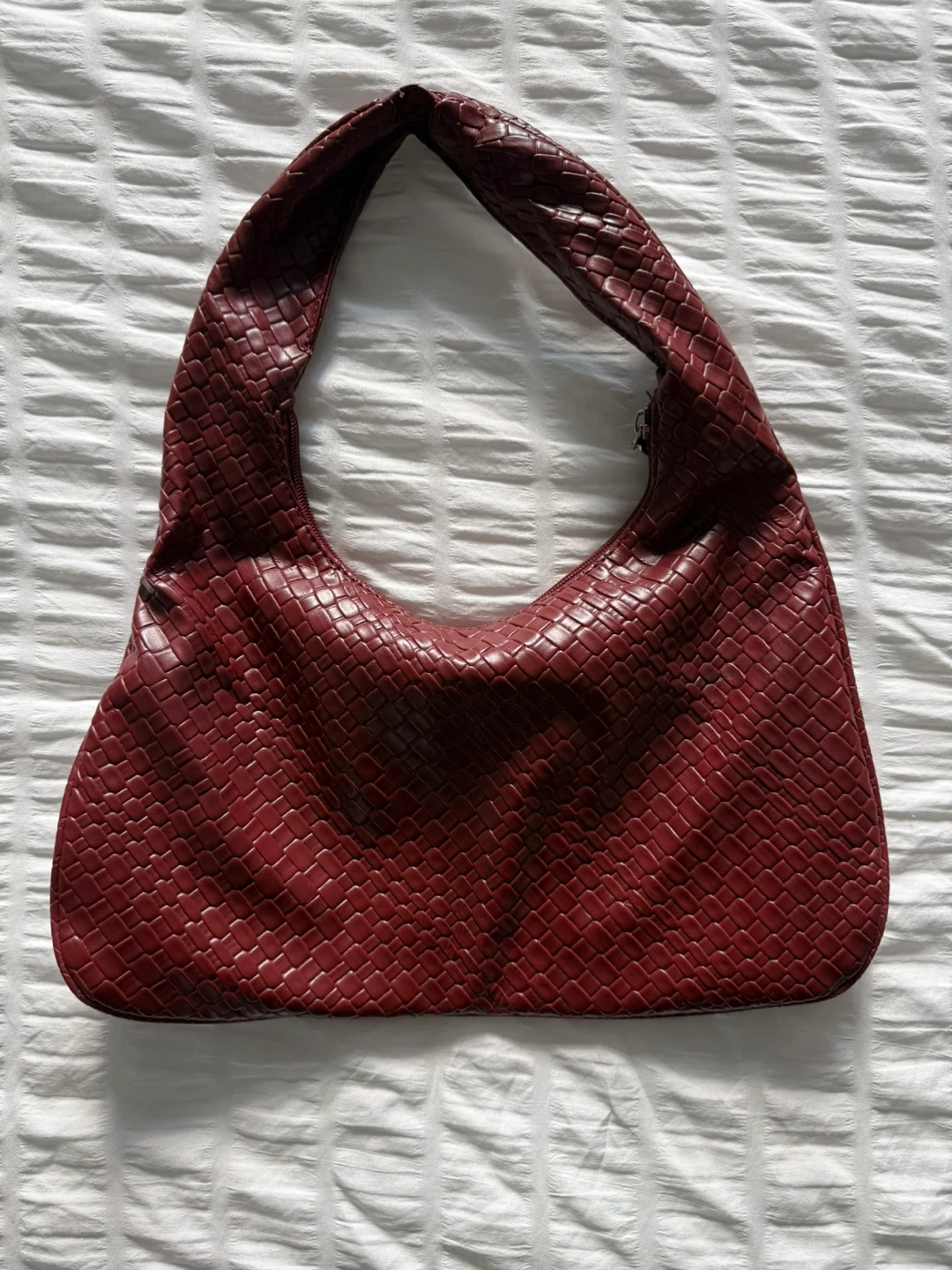 Here's a stylish burgundy hobo bag with a unique woven texture! It's perfect for adding a pop of color and texture to your outfit. The bag is in great condition and ready for a new home