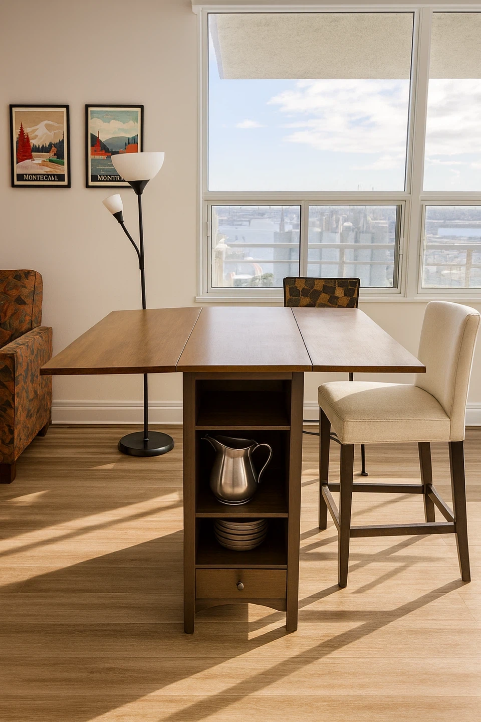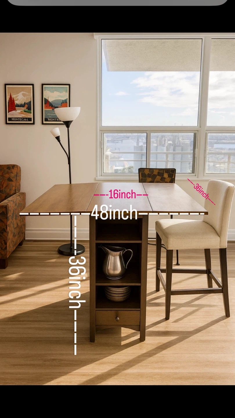 Selling a drop leaf dining table that’s perfect for smaller spaces! It has a built-in storage unit with shelves and a small drawer, ideal for keeping your dining essentials organized. The drop leaf design allows you to adjust the table size as needed, making it super versatile for everyday use or when you have guests over