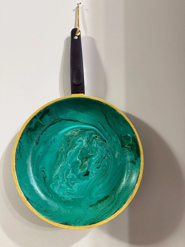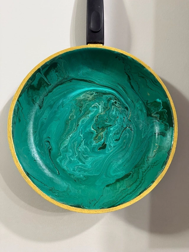 ✨ One-of-a-kind Functional Wall Art ✨ This handmade piece transforms an ordinary pan into a stunning swirl of emerald-green abstract art. Perfect for kitchens, studios, or anyone who loves unique decor! Hand-painted Gold-detailed rim Ready to hang Only one available!