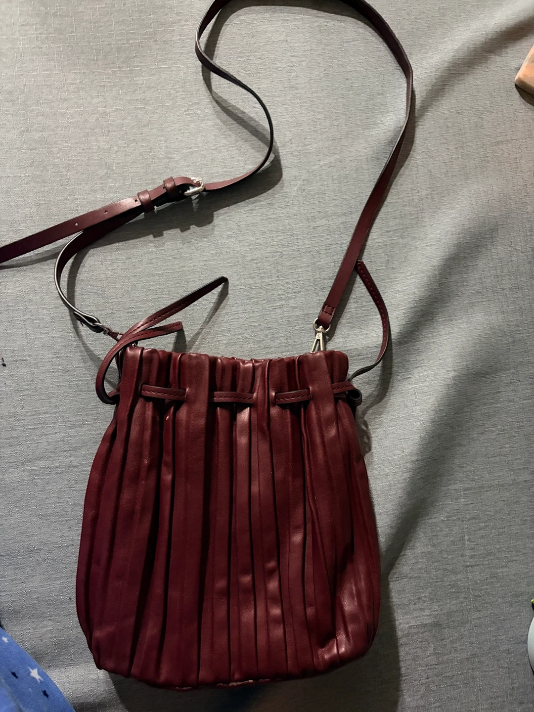 This is a super cute burgundy bucket bag! It has a unique pleated design and a drawstring closure. The bag also comes with a long strap so it can be worn as a crossbody