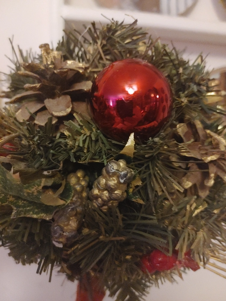 Two cute Christmas topiary decorations, perfect for adding a festive touch to your home! They feature pinecones, berries, and red ornaments.