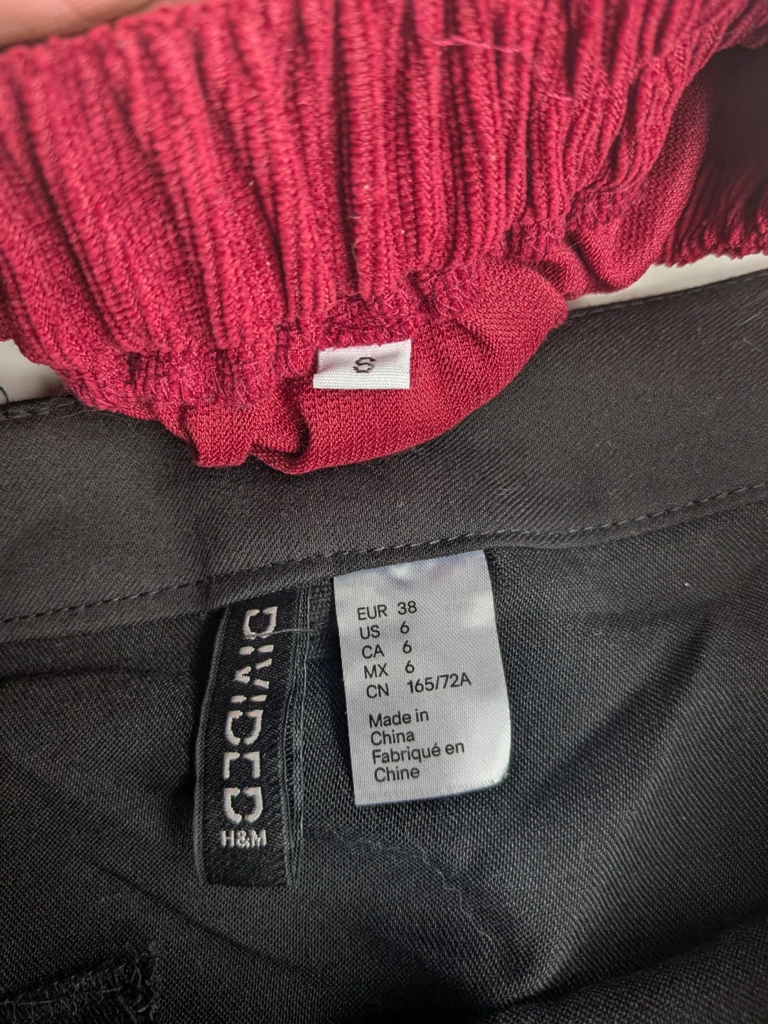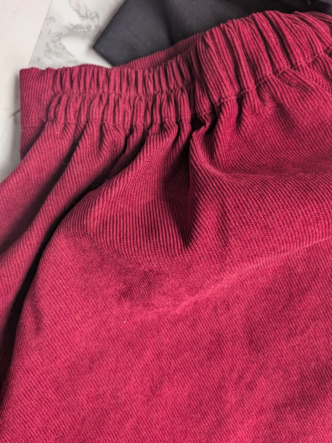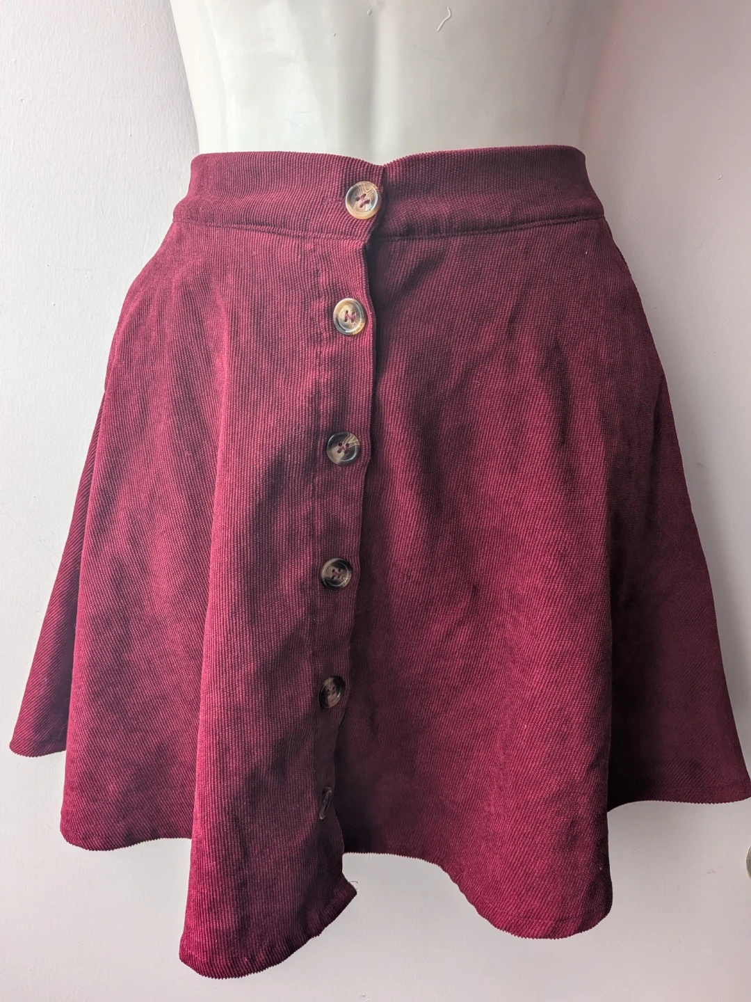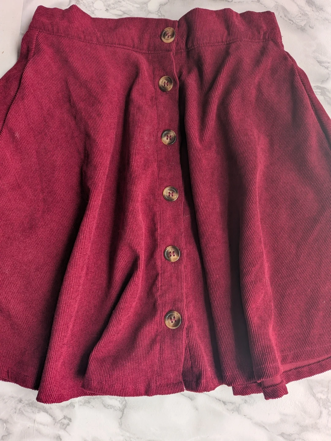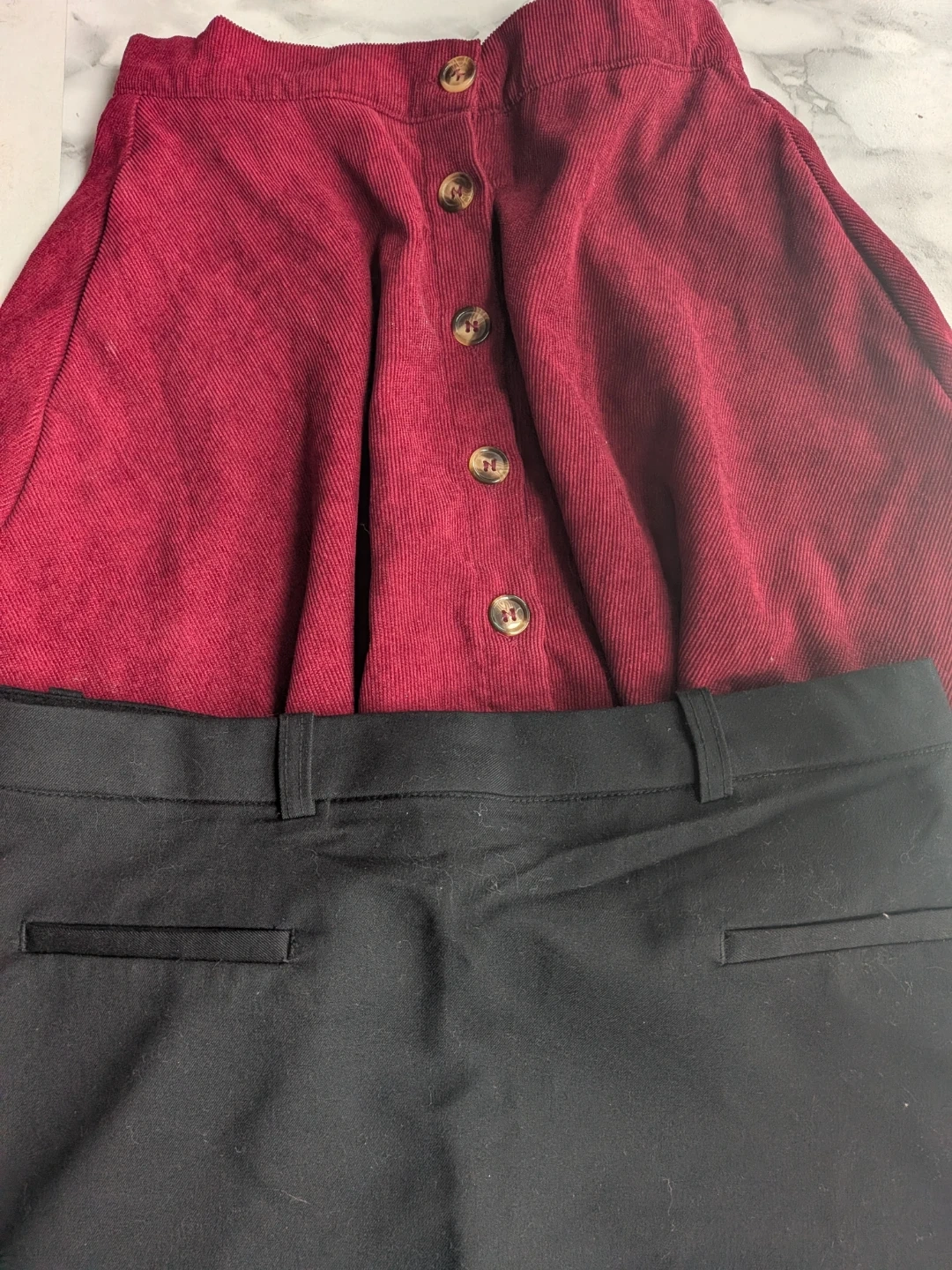 Here's two cute skirts, one burgundy corduroy and one black. It's a size small and features button detailing down the front. The material is lightweight, soft and comfortable, perfect for everyday wear