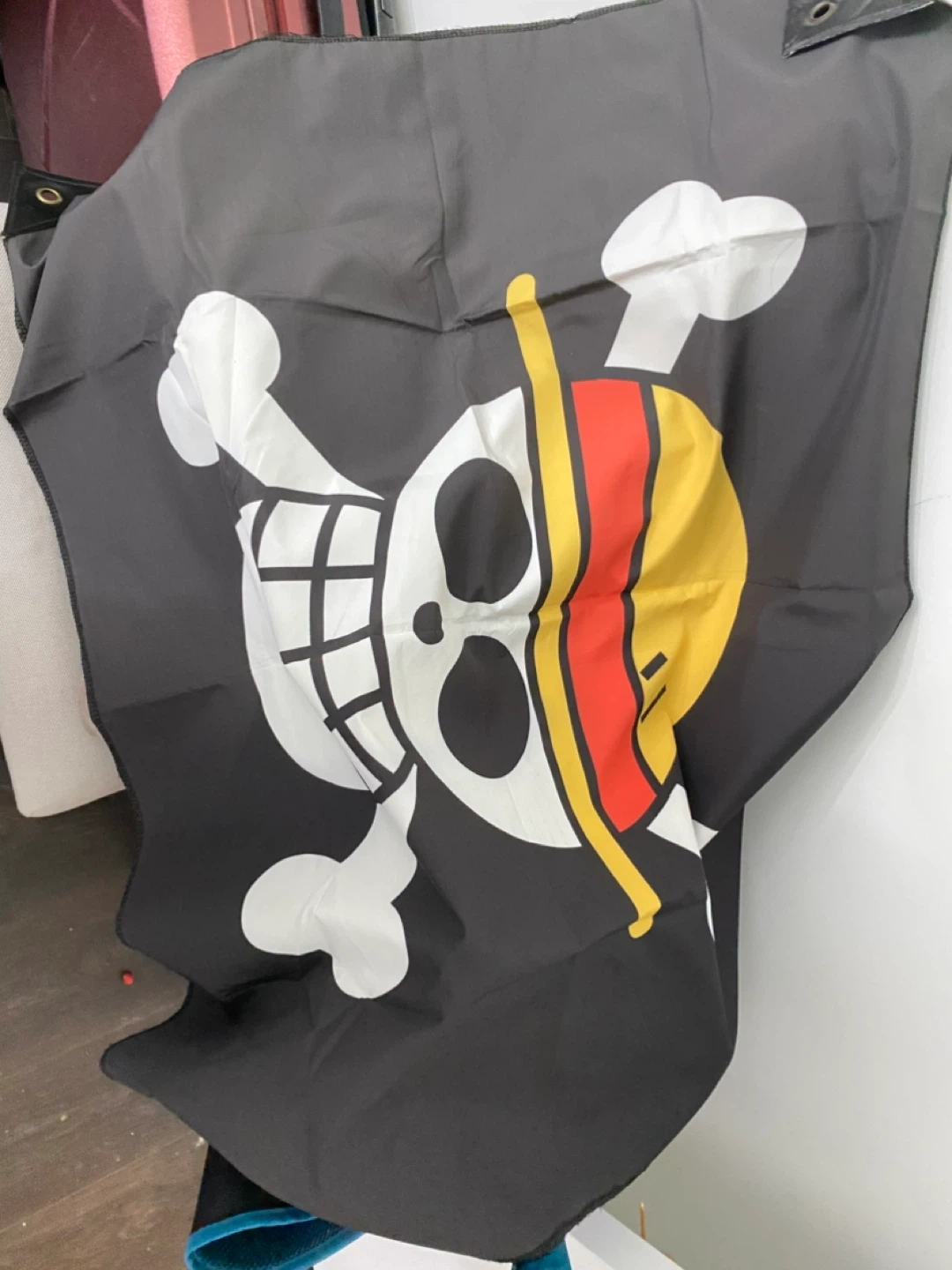 Selling a One Piece Jolly Roger flag! It features the iconic skull and crossbones design with Luffy's straw hat colours. Perfect for any anime fan! Only one left.