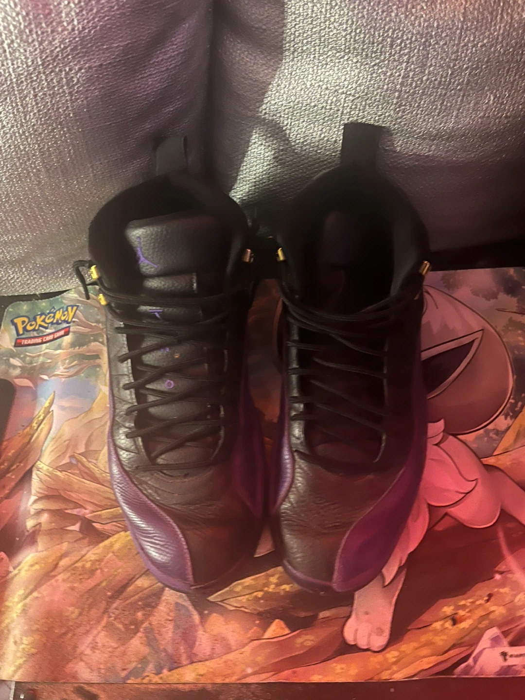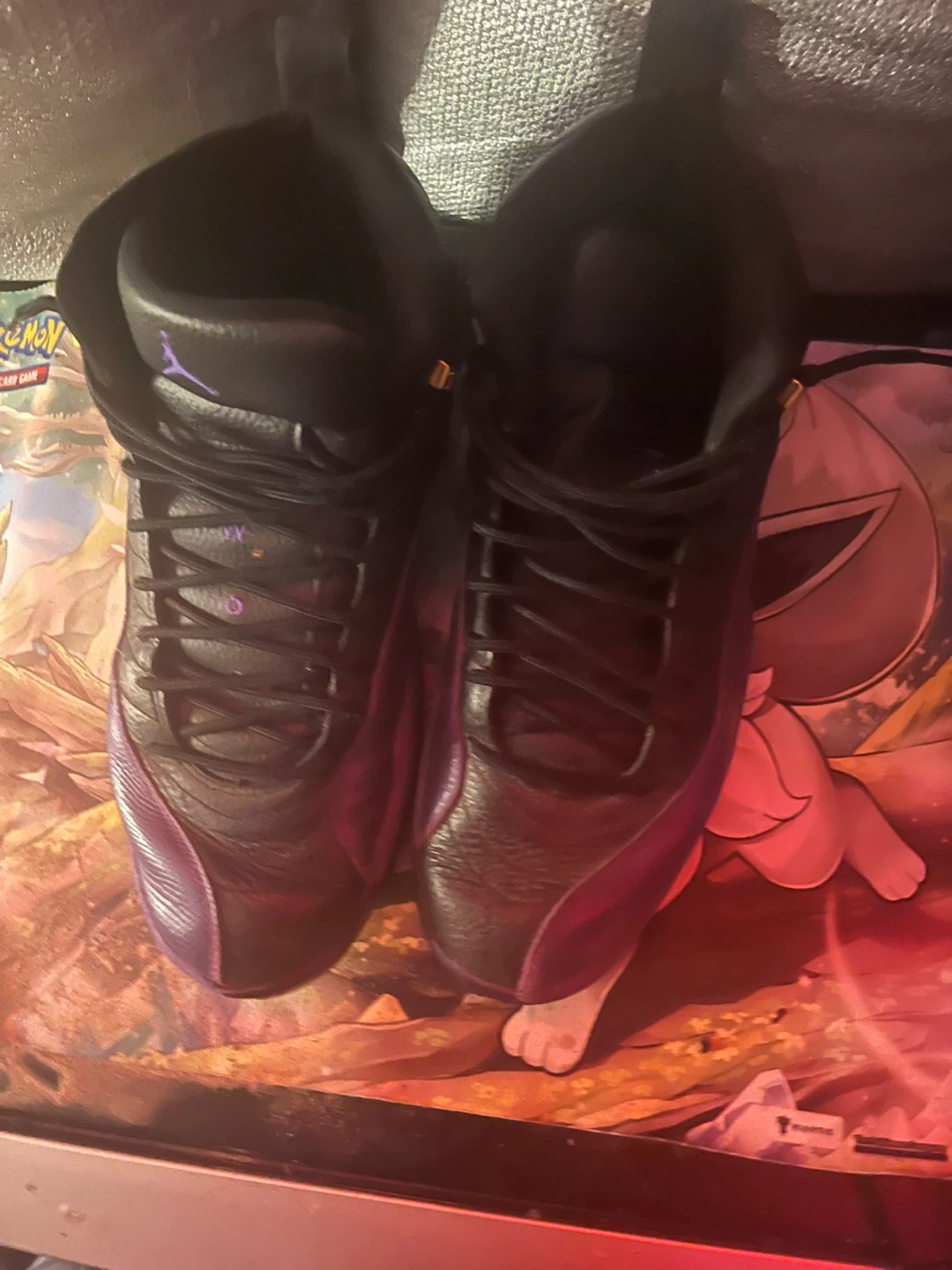 Selling a pair of Air Jordan 12 Retro sneakers in black and purple! They're in great condition. The size is 13 US.