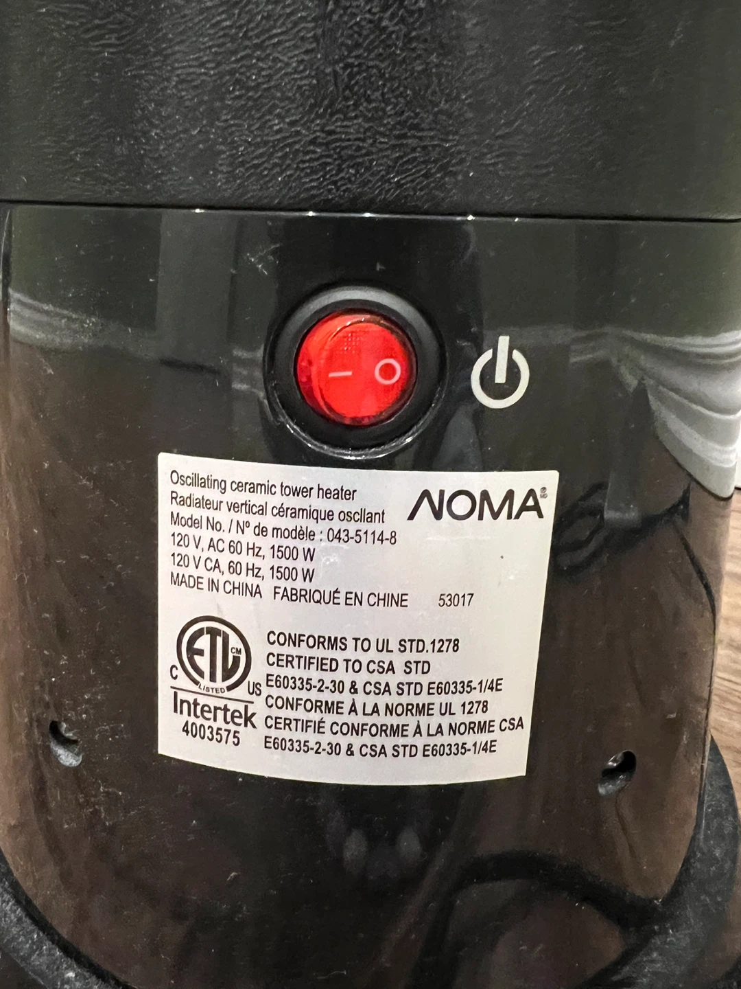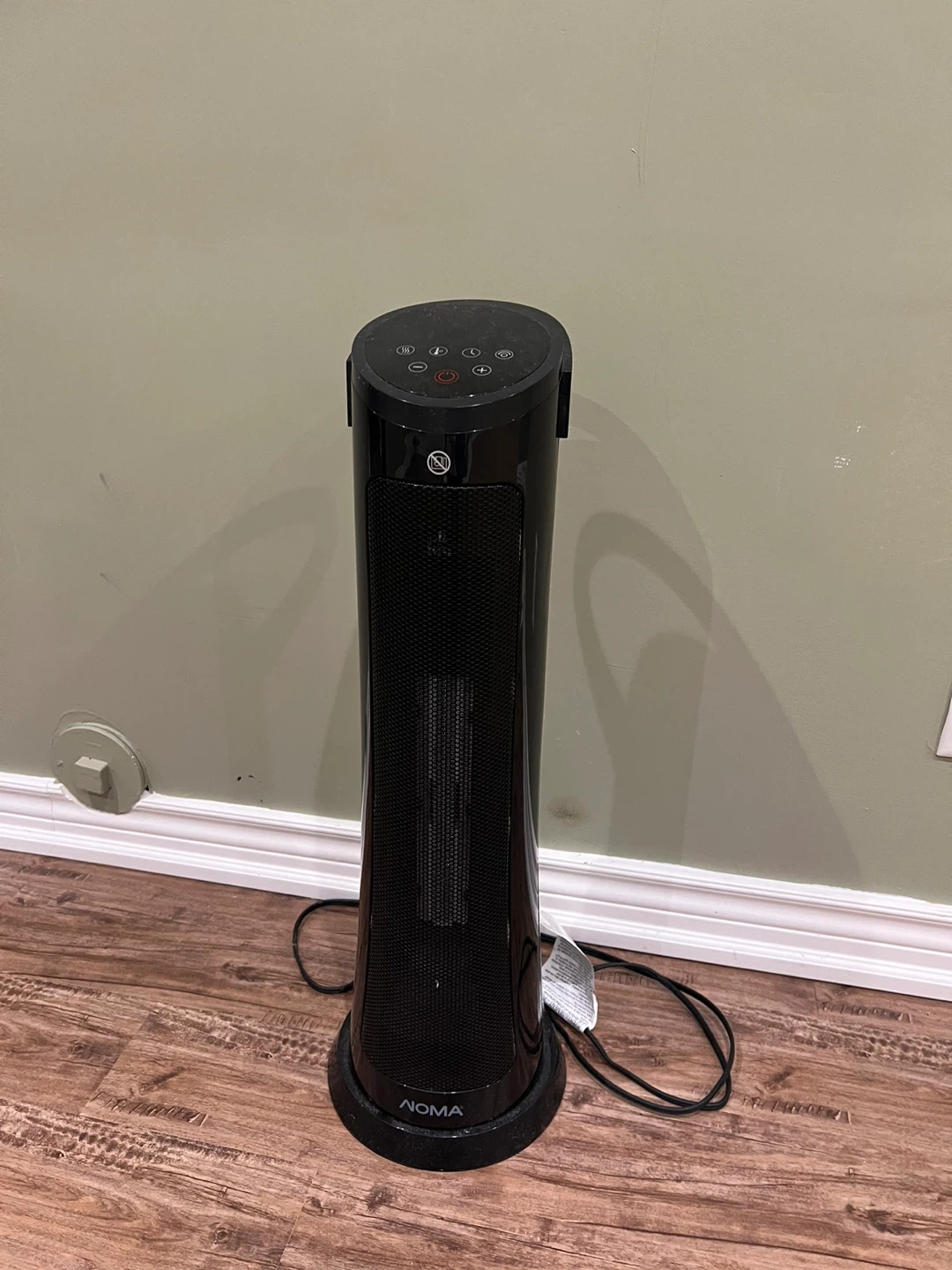 Selling a NOMA oscillating ceramic tower heater. This heater is black and features an oscillating function for even heat distribution. It's in good working condition and ready to keep you warm this winter!