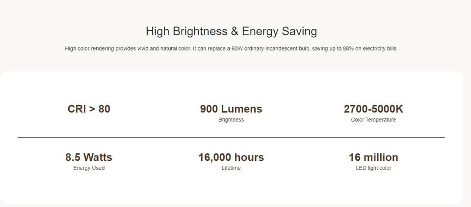 Access 16 million colors with professional color rendering (CRI >80) for studio-quality lighting effects. Smooth, flicker-free brightness control from 1% to 100%. Create custom schedules, scenes, and group controls for sophisticated lighting management. Real-time control with minimal latency through robust 2.4GHz Wi-Fi connection.