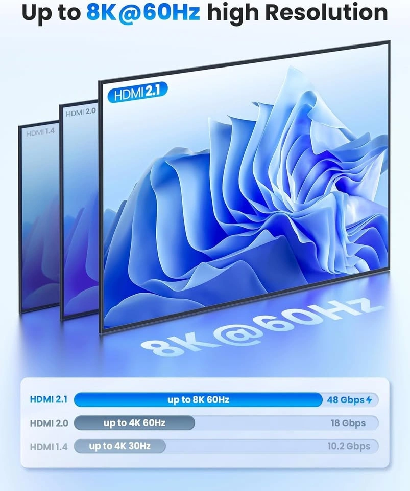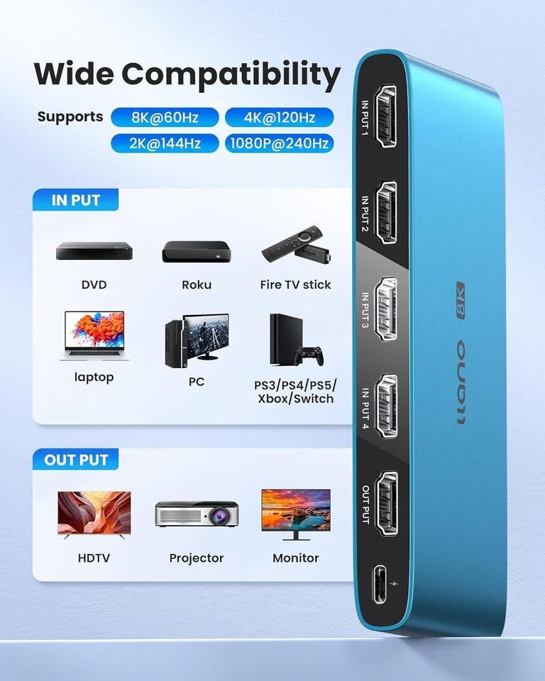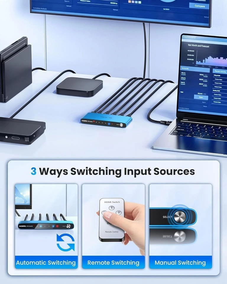 HDMI 2.1 Switch supports CEC, HDCP2.3, 3D, HDR10+ VRR ALLM for PS5 and Xbox (Blue).