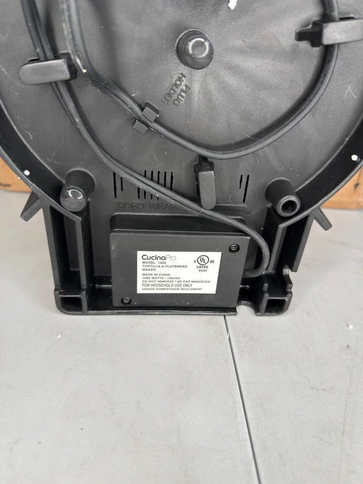 Heavy-duty aluminum maker with non-stick plates for evenly baked 10-inch tortillas, flatbreads, pitas, and more. Easy to use with a ready light, cord wrap, and upright storage. Ideal for tacos, quesadillas, and gyros. Unit size: 24.8 ร 33 ร 16.5 cm.