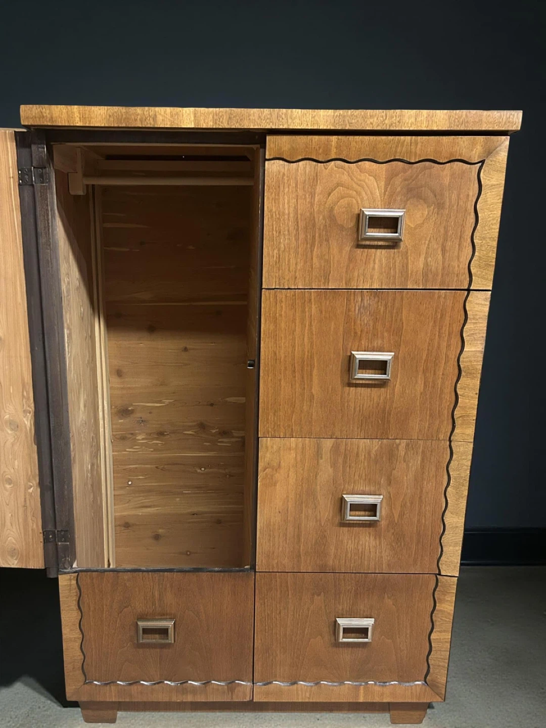 Vintage Art Deco Burl Wood Tallboy - wardrobe cabinet - 4 large drawers - side door opens to cedar lined wardrobe -