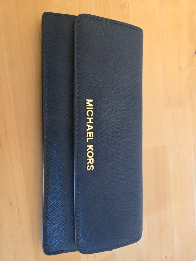 Selling a Michael Kors wallet in blue. It's in great condition and has lots of slots for cards and cash. Gently used.