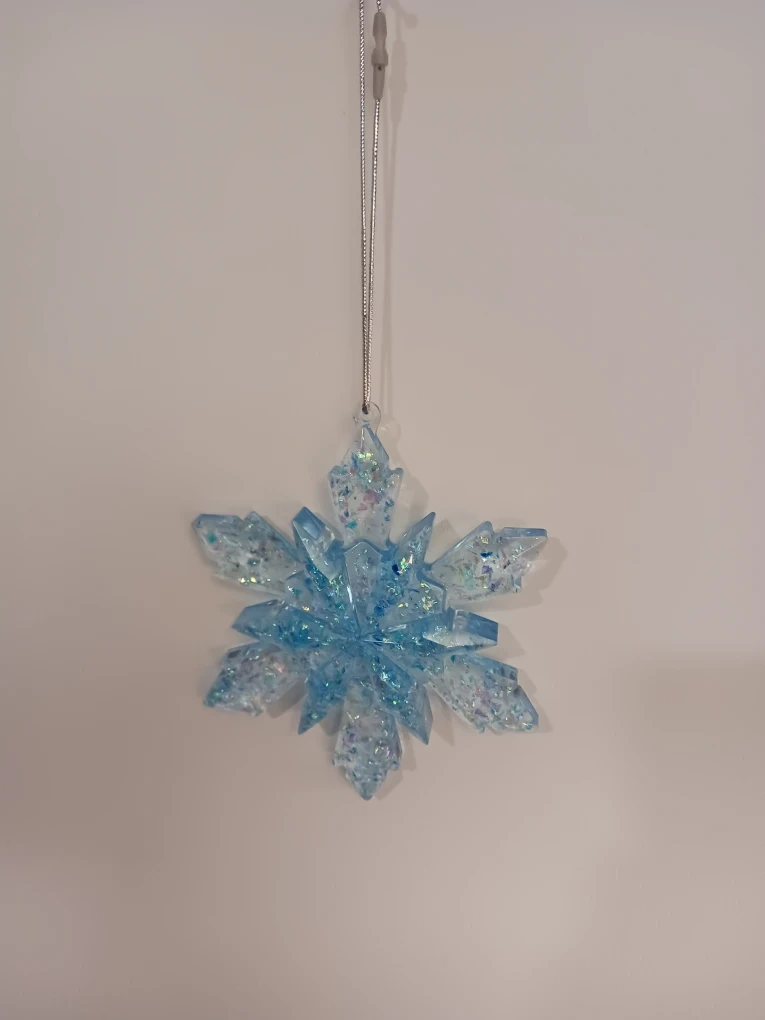 This is a large clear resin snowflake ornament with blue glitter flakes inside! It would be perfect for decorating your home for the holidays, either on the tree or on a wall. A few together would make a nice winter scene. Lots of resin. Very thick. Sparkles like diamonds. Includes locking cord in silver. Never lose the hanging cord.