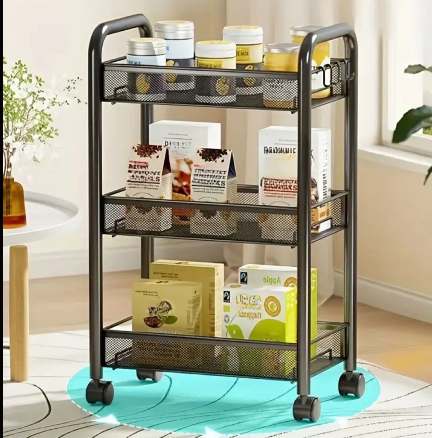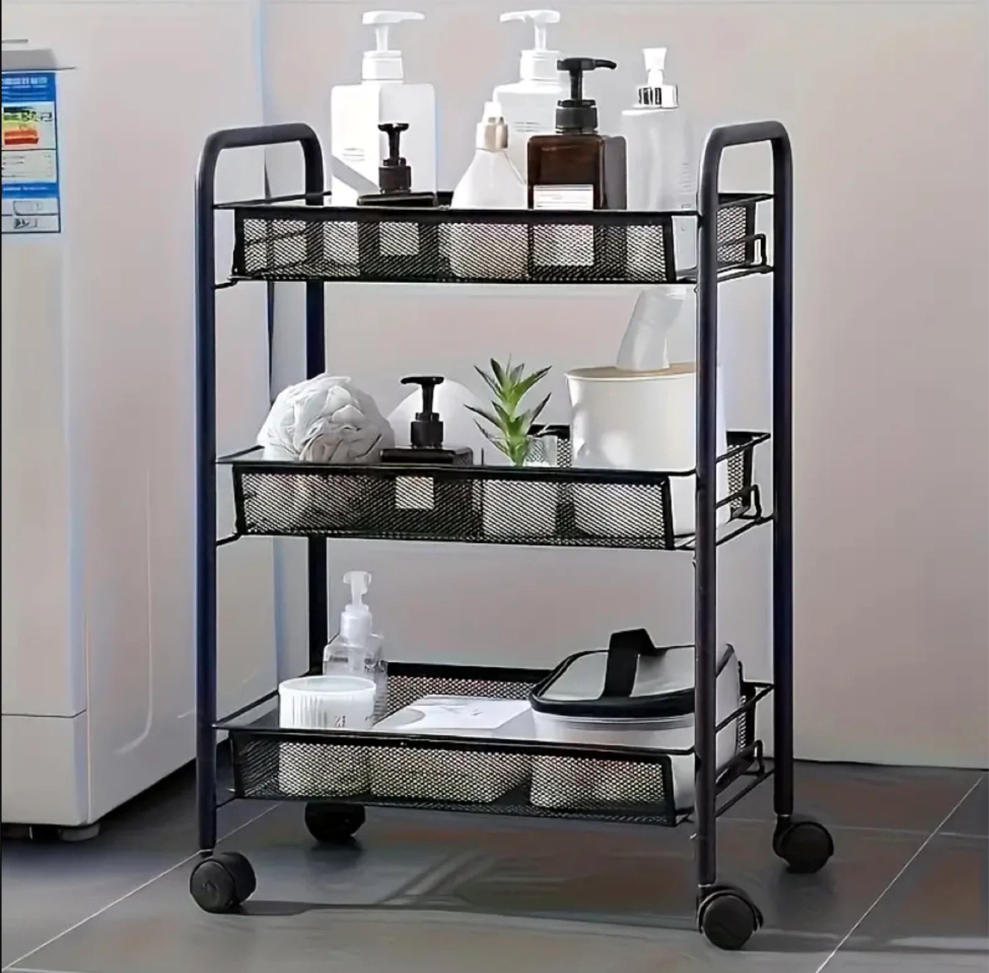 Looking to add some organization to your space? This black 3-tier rolling utility cart is just the thing! It's perfect for the kitchen, bathroom, or any room that needs a little extra storage. The rolling design makes it easy to move around, and the mesh baskets are great for storing all sorts of items. Material is metal.