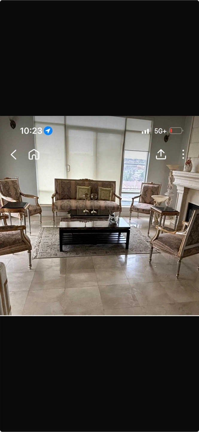 Selling a living room set that includes a sofa and multiple chairs. The set features a classic design with ornate detailing and a brown patterned upholstery. It would be a great addition to any home!