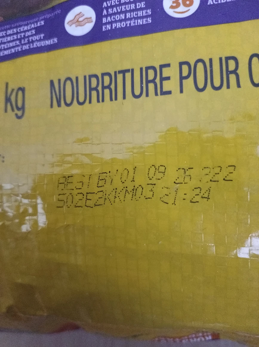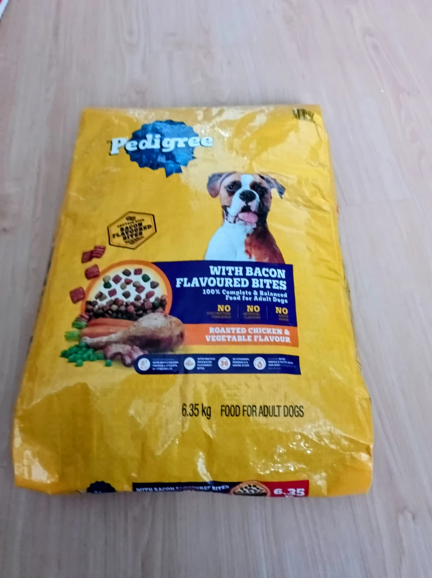 Here's a bag of Pedigree dog food with bacon flavoured bites! It's a 6.35 kg bag of food for adult dogs. The best before date is 2026 September 01