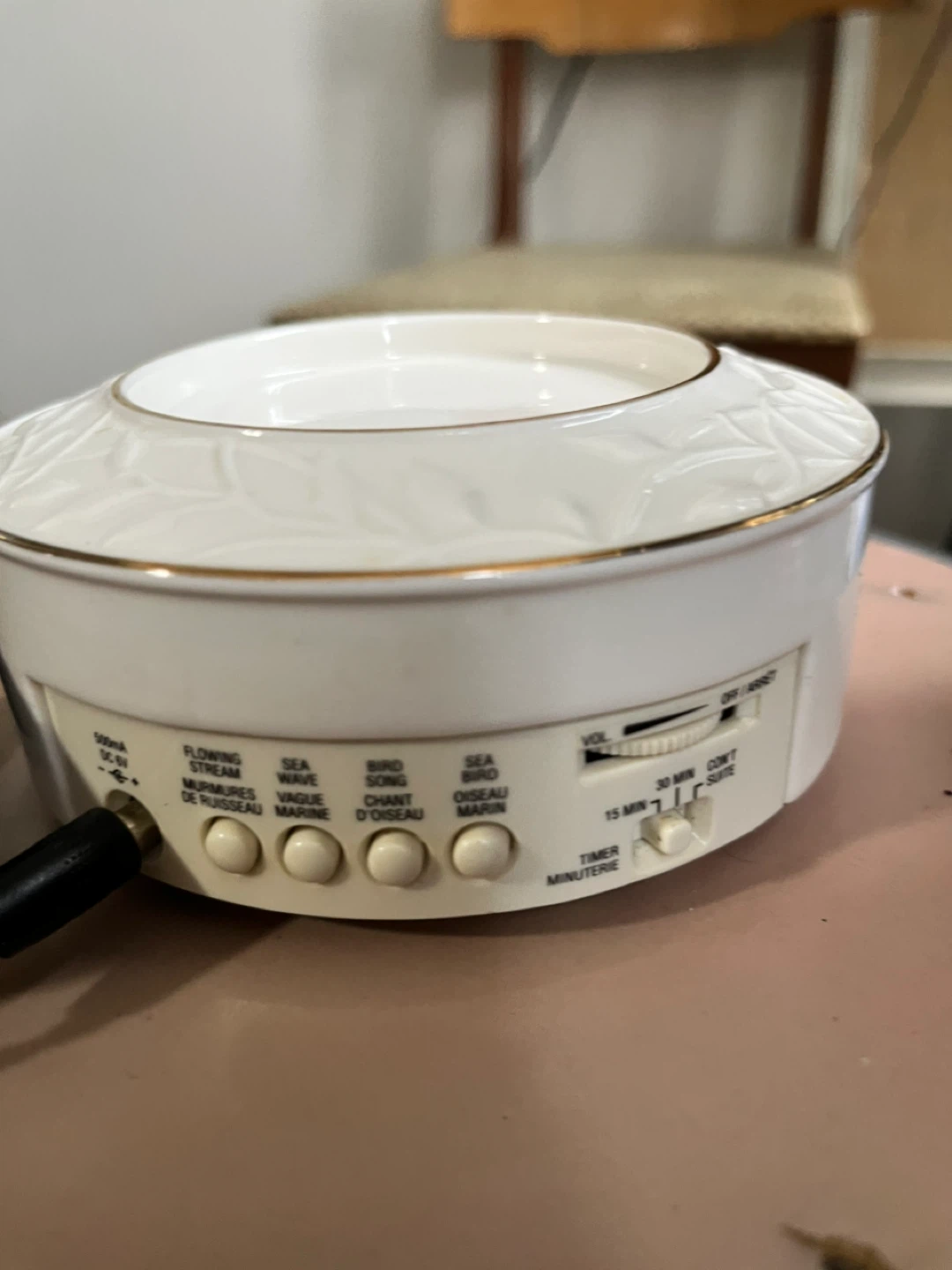 Selling a Sound Oasis sound therapy system! It features different sound options such as flowing stream, sea wave, bird song, and more. It also has a timer with 15 and 30-minute options, plus a continuous setting. Comes with the adaptor.