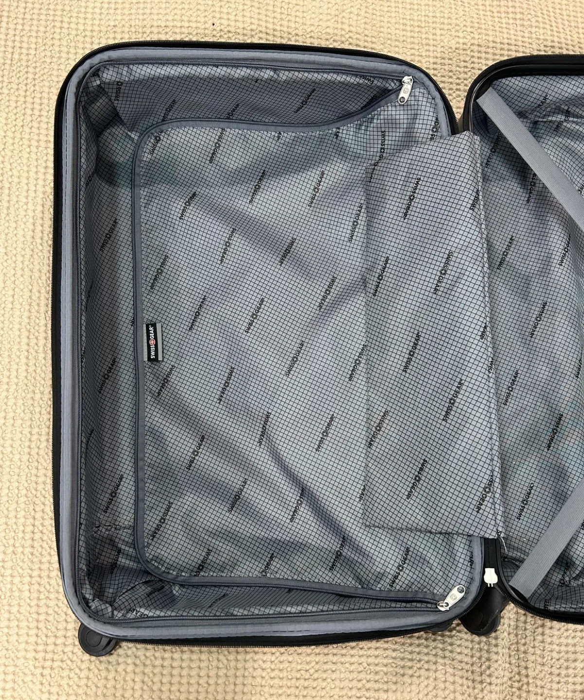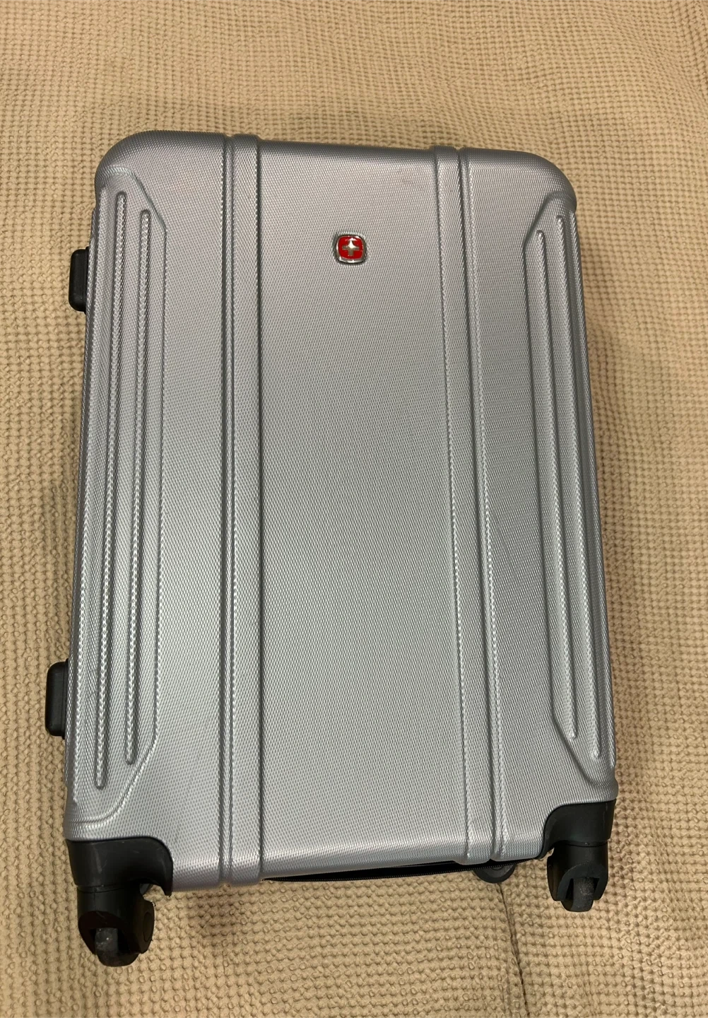 This Swissgear suitcase is in great shape and ready for your next trip! It's a nice silver colour and has a spacious interior with a handy divider and straps to keep everything in place. Medium size