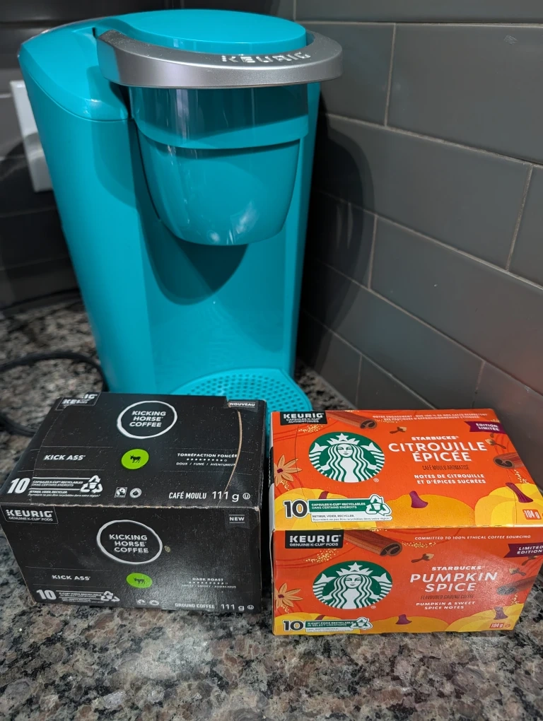 Keurig Coffee Maker + Kicking Horse & Starbucks Pods