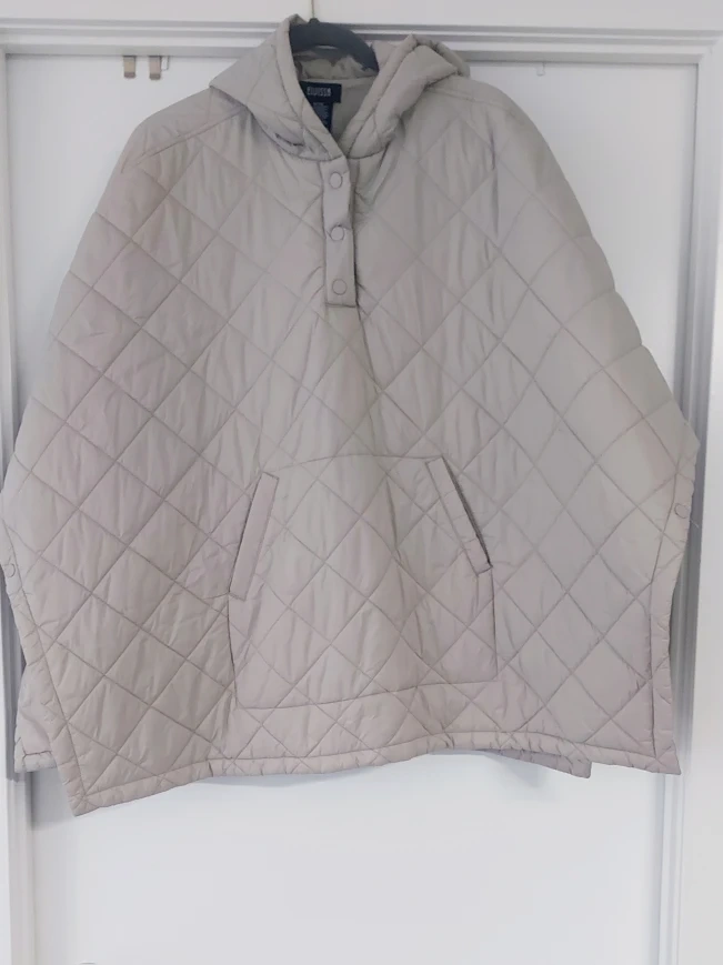 Here's a cozy Eidissa quilted poncho! It's a size G/TG, fits XXL and features a handy hood and a front pocket. The shell and lining are 100% nylon, while the filling is 100% polyester. Perfect for chilly days!
