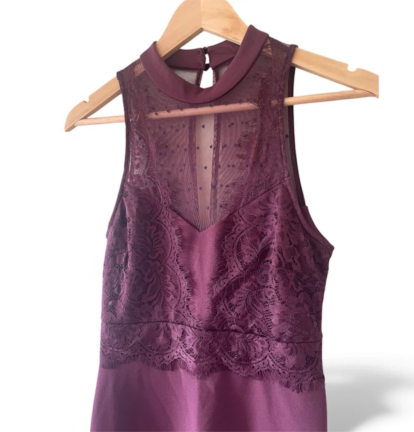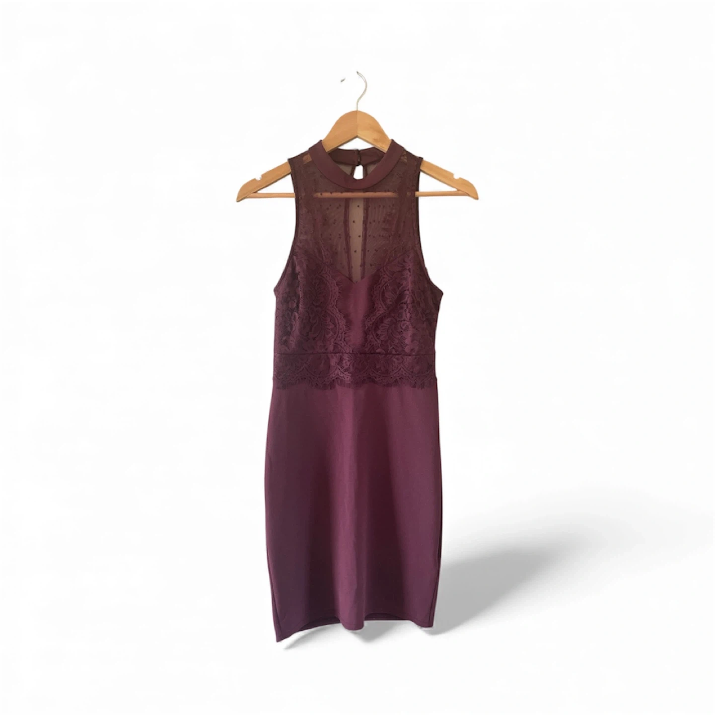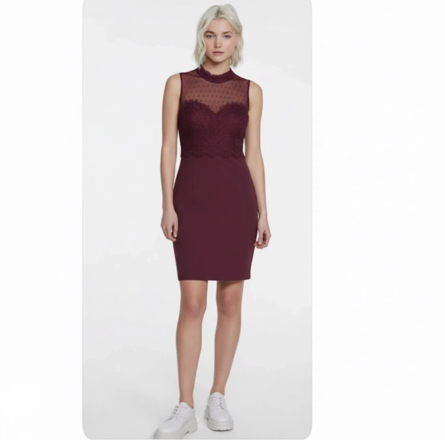 Chic burgundy mini dress with lace and mesh details from New Look. Sleeveless design. Perfect for a night out or special occasion. Size US 4. In mint condition.