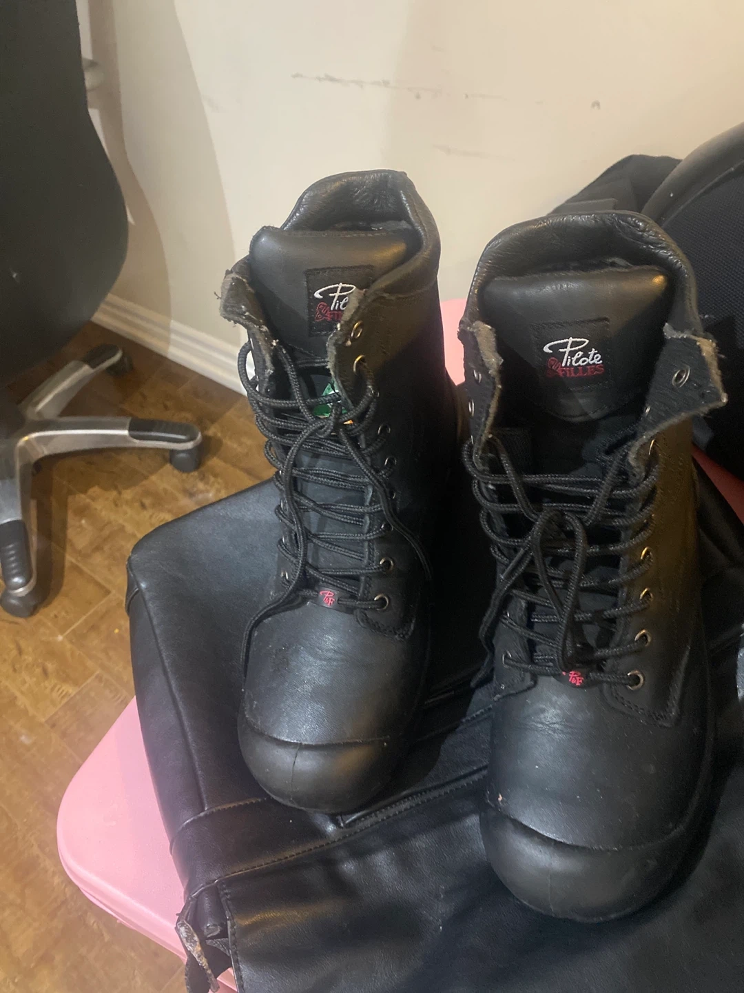 Selling a pair of Pilote work boots in black leather. They show some signs of wear but are still in good condition for work. They are lace-up style and have a rugged look.