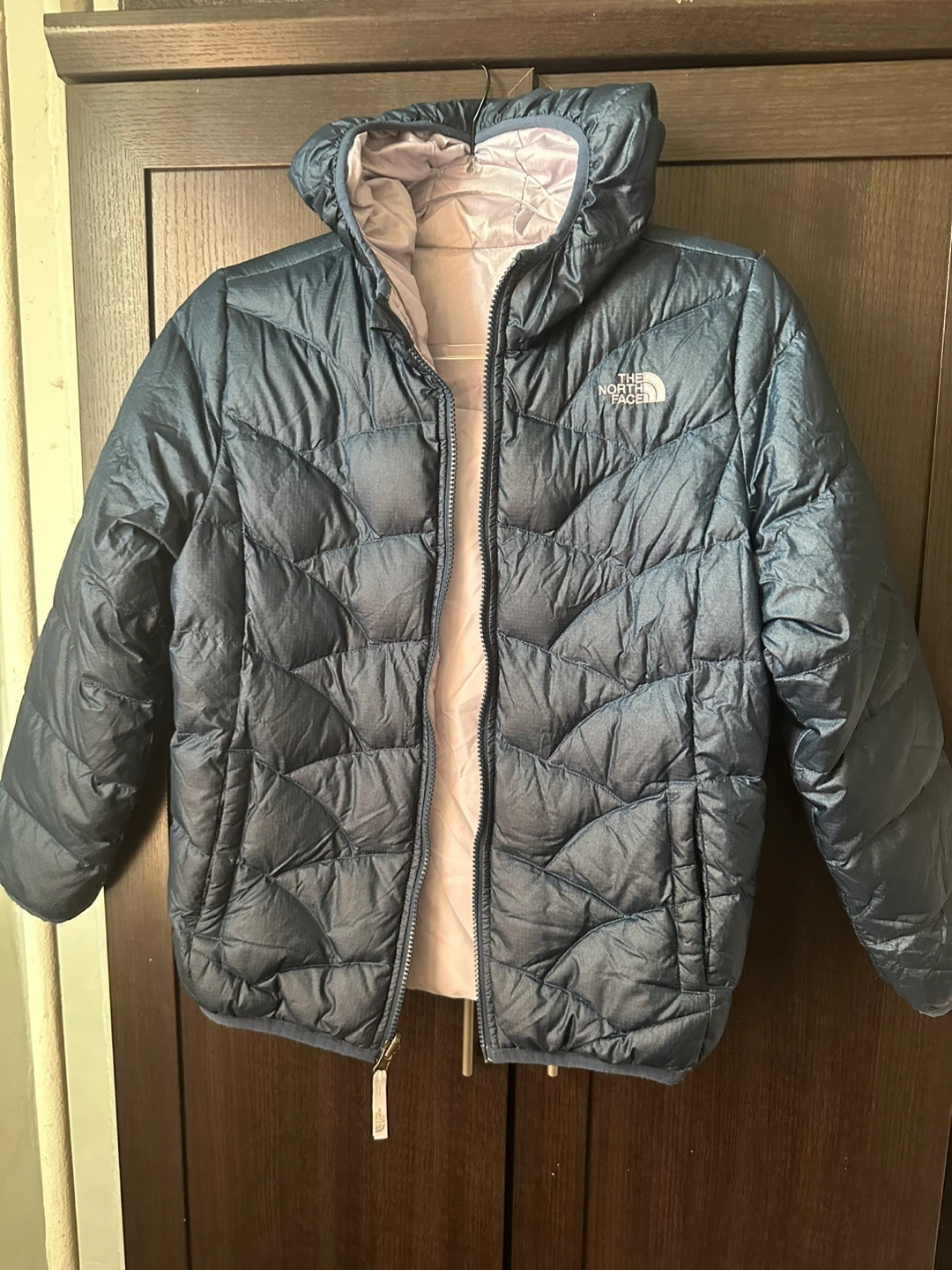 Selling a girl's reversible blue (inside lavender)puffer jacket from The North Face! It's a size large (14/16) and features a stylish design. The outer material is 100% nylon, and the filling is down. Perfect for keeping warm and cozy! Pick up only! East 106 and 1st ave!