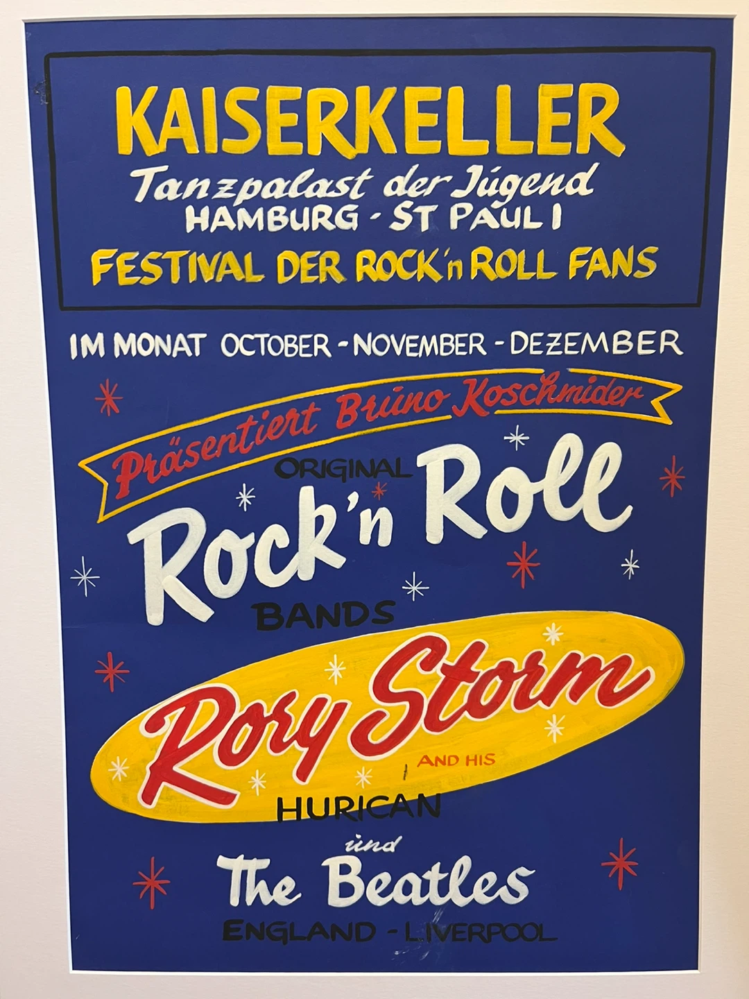 Own a piece of music history with this hand-painted poster advertising The Beatles' performances at the Kaiserkeller in Hamburg in 1960. This unique poster captures a pivotal moment in the band's early career, showcasing their gigs alongside Rory Storm and other rock 'n' roll acts. This is a gently used poster with very little wear. A faithful reproduction of the original hand painted poster.