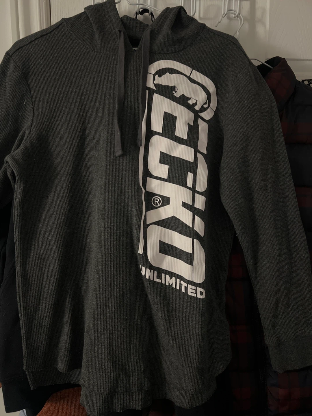 Selling a grey Ecko Unlimited hoodie. It's in great condition and ready for a new home! The hoodie features the brand's logo prominently on the front. Perfect for casual wear or layering during cooler weather