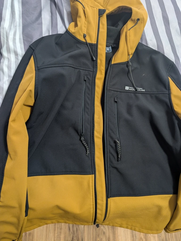 Selling a Mountain Warehouse soft shell jacket in size large. It's in great condition and ready for a new home! The jacket is water-resistant, making it perfect for those unpredictable weather days. It features a stylish design with a black and mustard colour block. Perfect for outdoor activities or just everyday wear