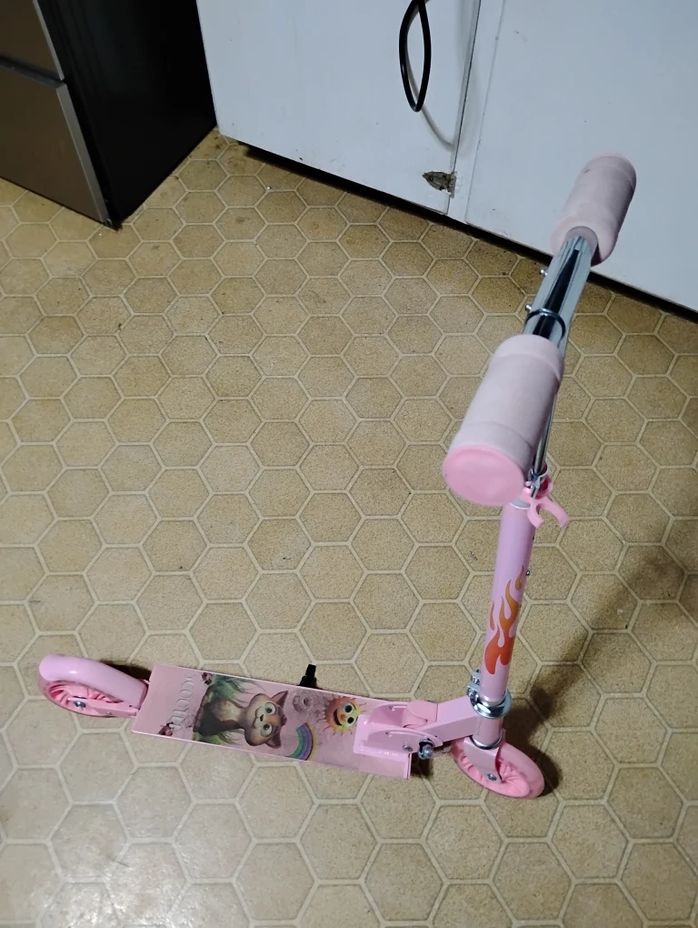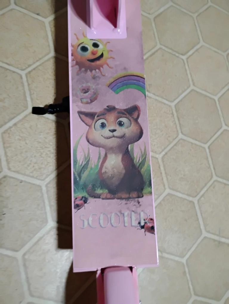 Selling a cute pink scooter for kids. It has fun cartoon graphics on the deck and is in good condition. Perfect for learning to scoot around!