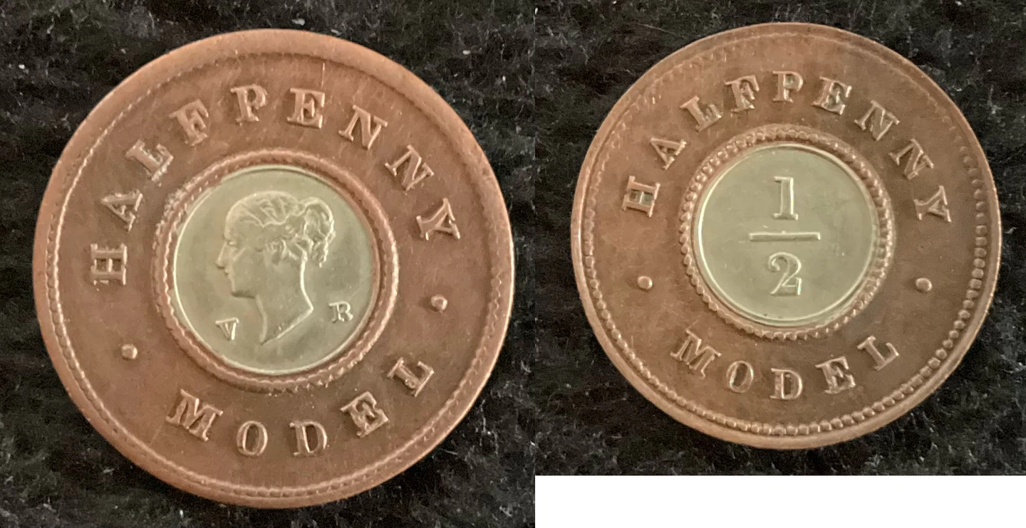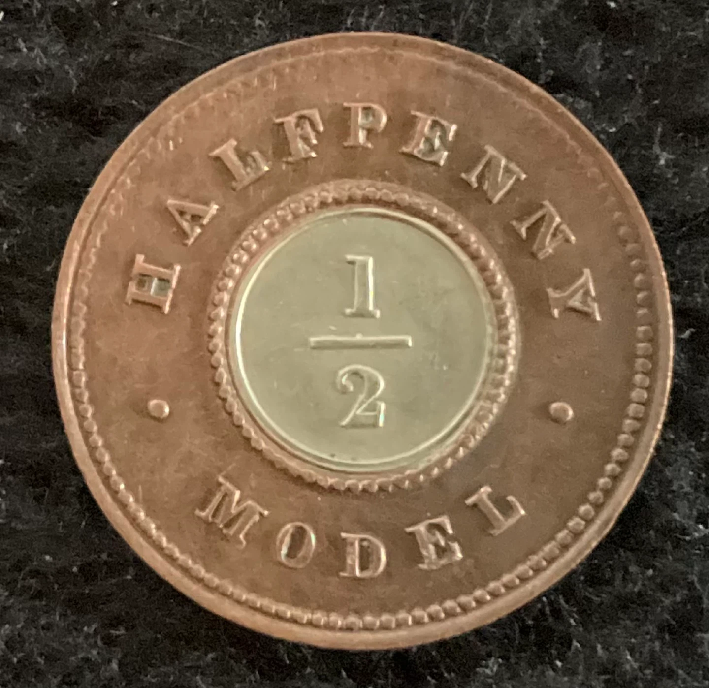 Selling a halfpenny model coin. It features 'HALF PENNY MODEL' text around the edges with a central design of Queen Victoria. About the size of a dime. Great condition!