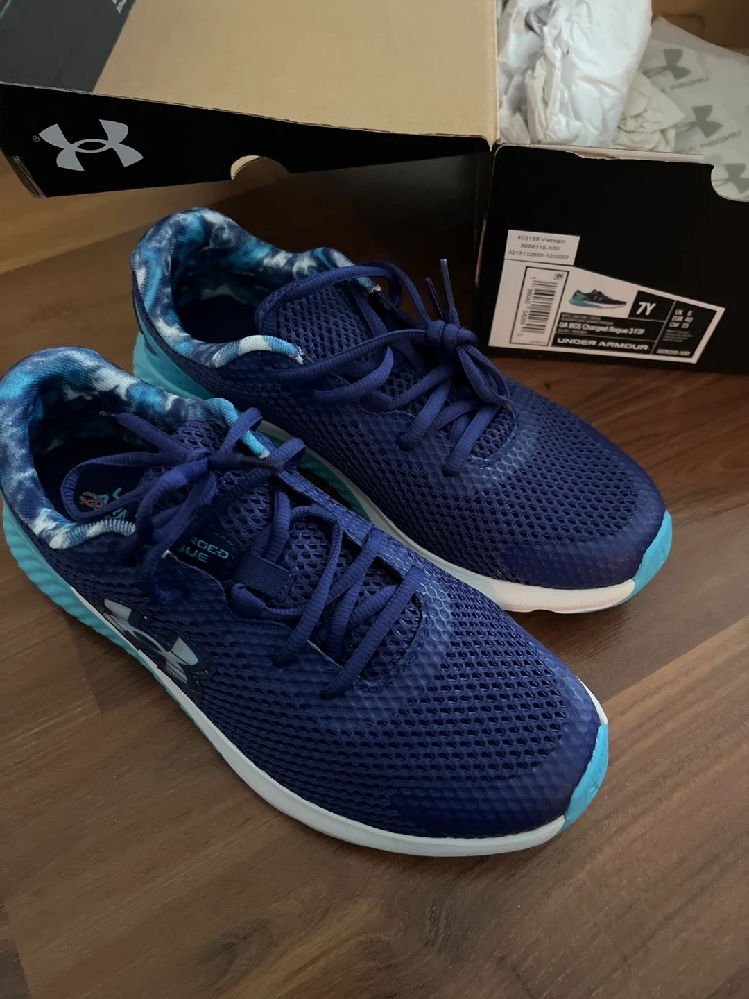 Selling a pair of brand new (in box) Under Armour Charged Rogue 3 F2F running shoes for youth in size 7Y, dark blue. Great for active kids!