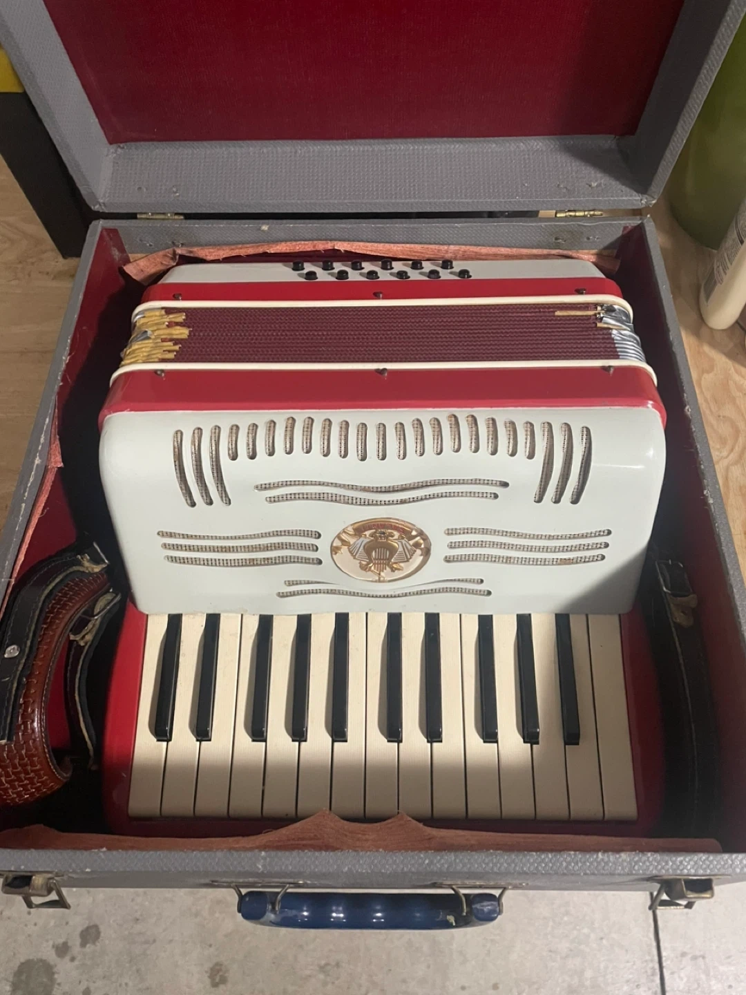 Selling a vintage accordion that comes with its original case. It appears to be in good condition for its age. Perfect for someone interested in learning or collecting musical instruments
