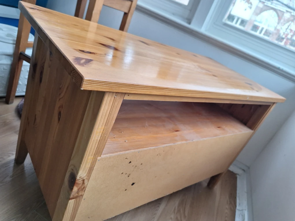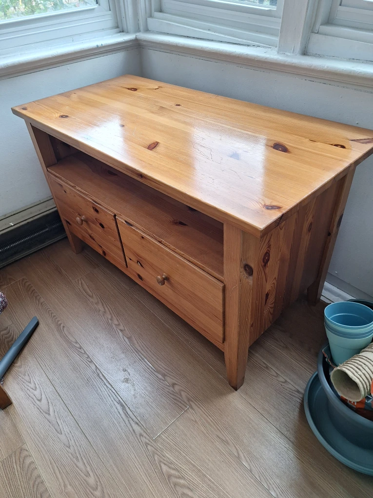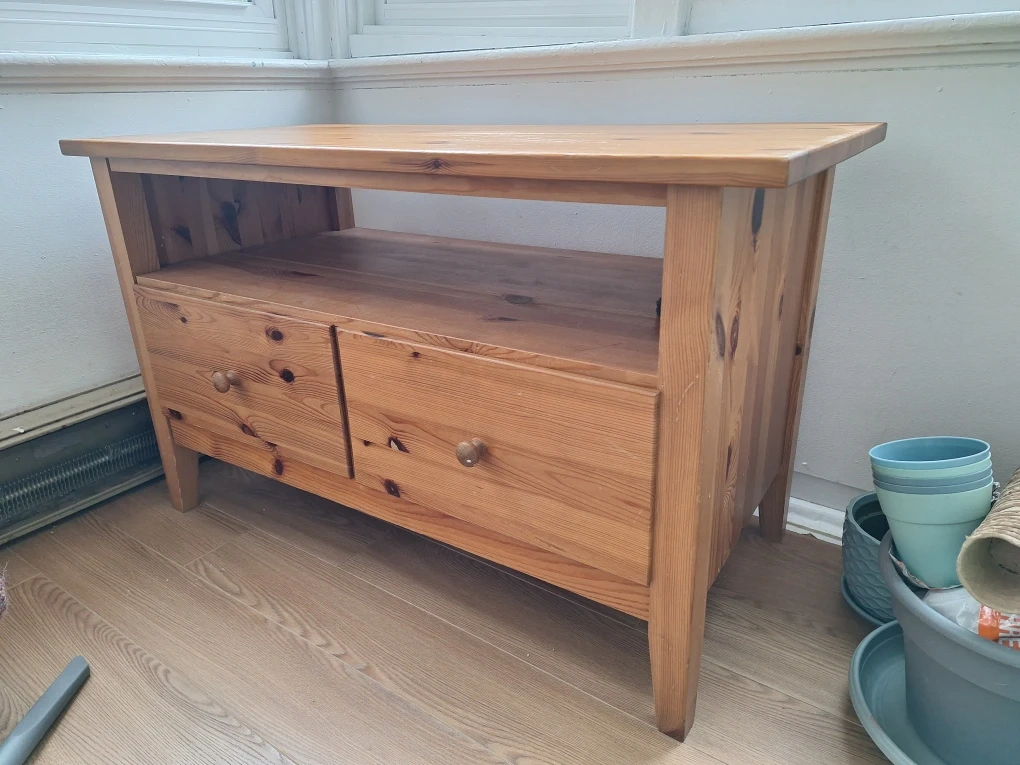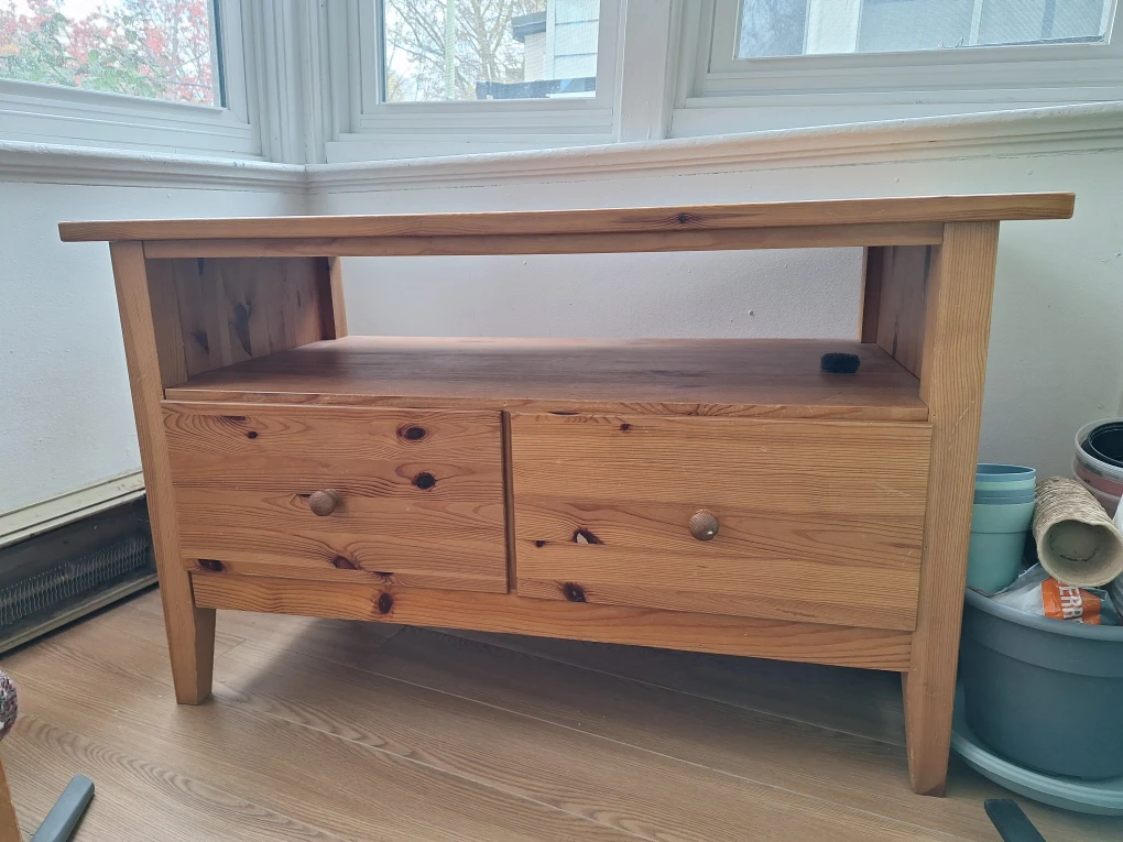 Here's a cute wooden TV stand with two drawers! Served its purpose well, actually surprised by the amount of things I could store in those 2 drawers. It's in good condition and ready for a new home