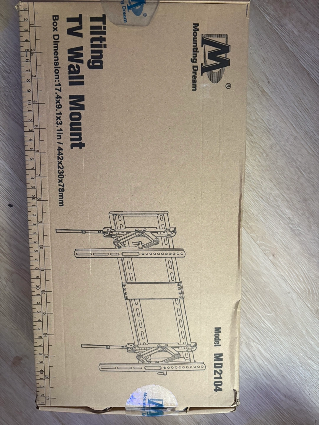 Selling a Mounting Dream Tilting TV Wall Mount, model MD2104! The box dimension is 17.4x9.1x3.1in / 442x230x78mm. It extends 7" from the wall for easy cable access and retracts 2.68".