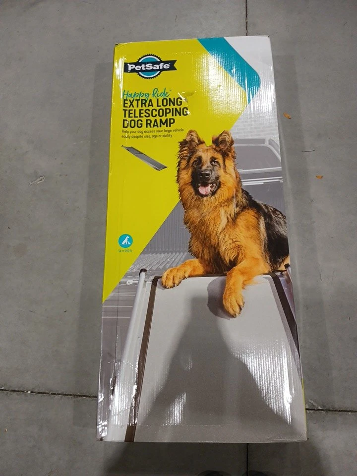 This is a PetSafe Happy Ride extra-long telescoping dog ramp that extends from 47" to 87" and can support up to 300lbs. It's lightweight and easy to manoeuvre, making it perfect for travel.