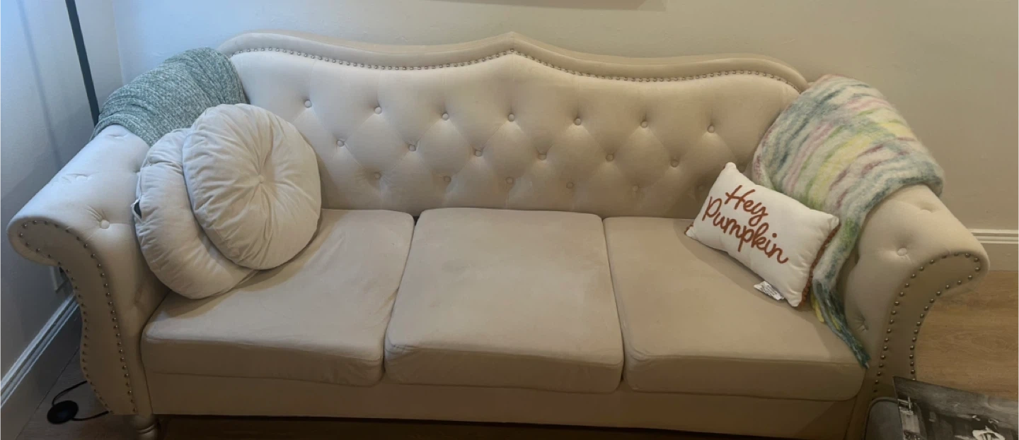 Selling a beautiful velvet beige sofa. It's in great condition and would look lovely in any living room. The sofa has a vintage design with button-tufted detailing and silver-tone nailhead trim.