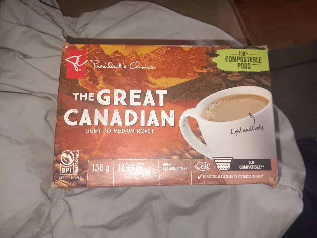 Selling a box of President's Choice The Great Canadian light to medium roast coffee pods. They are 100% compostable and compatible with 2.0 brewing systems. Each box contains 12 single-serve pods, with 100% Arabica coffee and no artificial flavours or synthetic colours