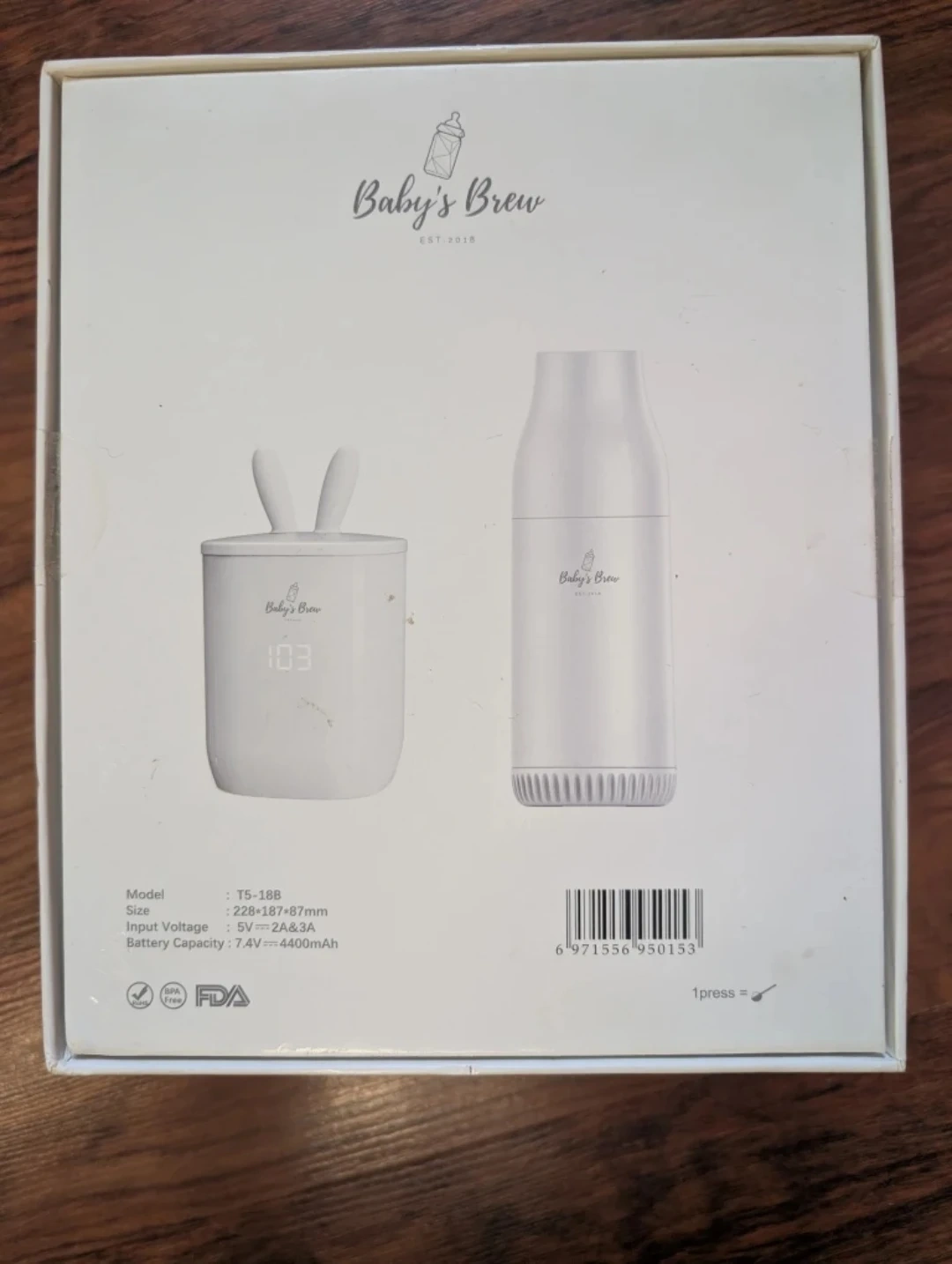 60Selling a Baby's Brew portable bottle warmer. It's in like-new condition and comes with the box! The model is T5-18B. It's a great way to warm bottles on the go. The size is 228 x 187 x 87mm. Input voltage is 5V=2A&3A and battery capacity is 7.4V=4400mAh