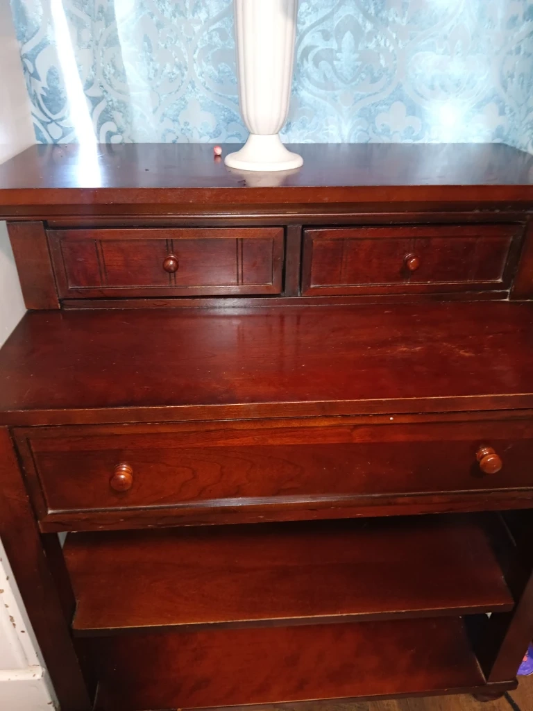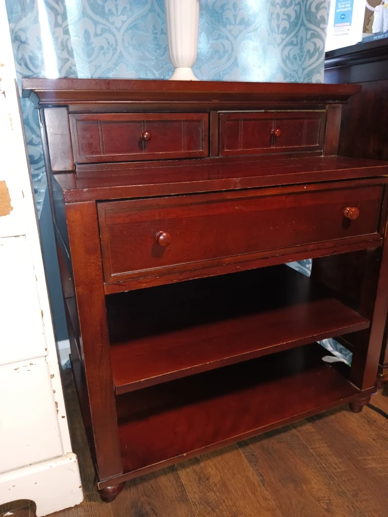 Here's a charming wood nightstand with a rich, dark finish! It features two small drawers up top, a larger drawer below, and open shelving for extra storage. Perfect for keeping your bedside essentials organized and within reach. These are two of them.