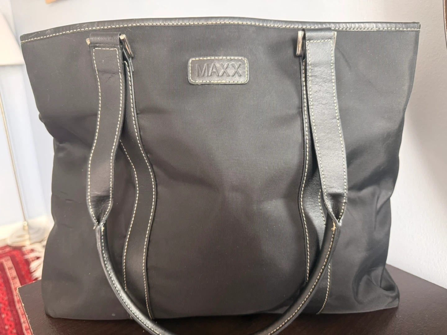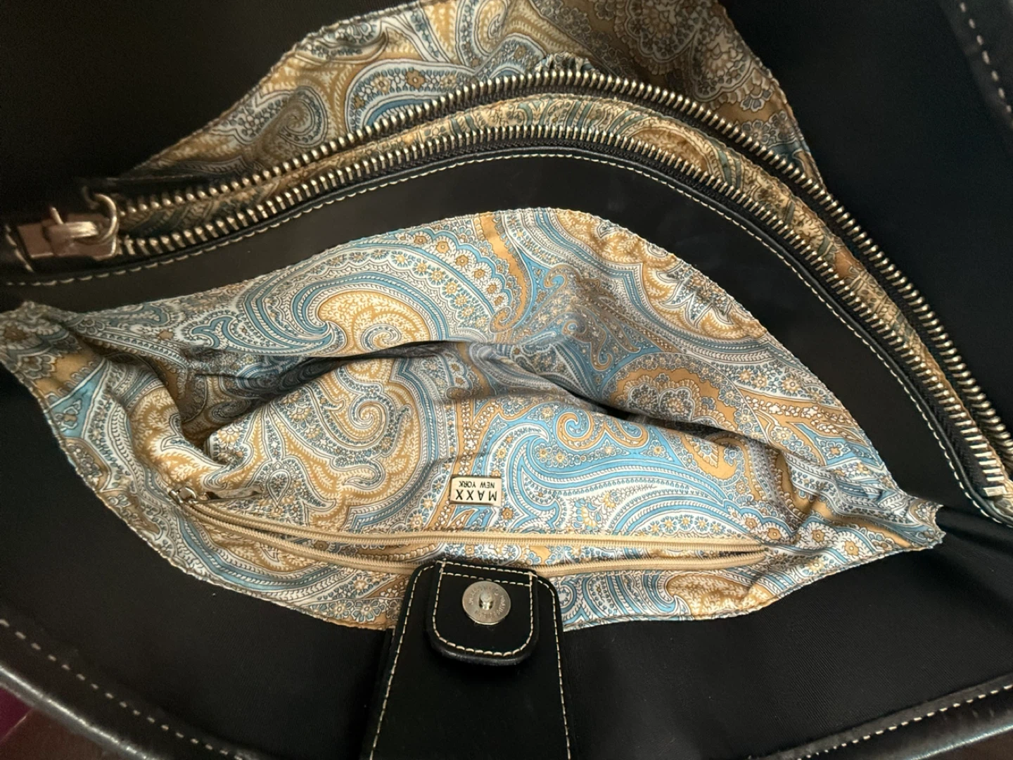 This is a MAXX New York black tote bag. It's in great condition and ready for a new home! It features a stylish paisley patterned interior lining and durable leather straps