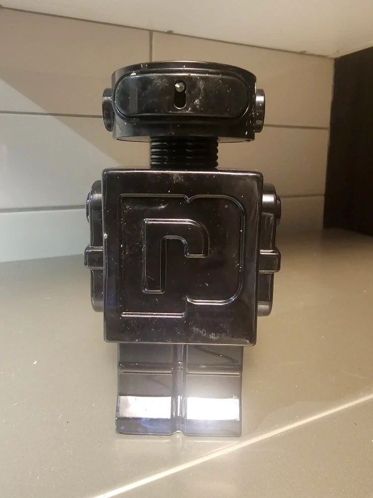 Selling a bottle of Paco Rabanne Phantom Parfum, presented in its distinctive robot-shaped container. This fragrance is described as a bold, sophisticated scent for men. 90-95% filled. Authentic!!!