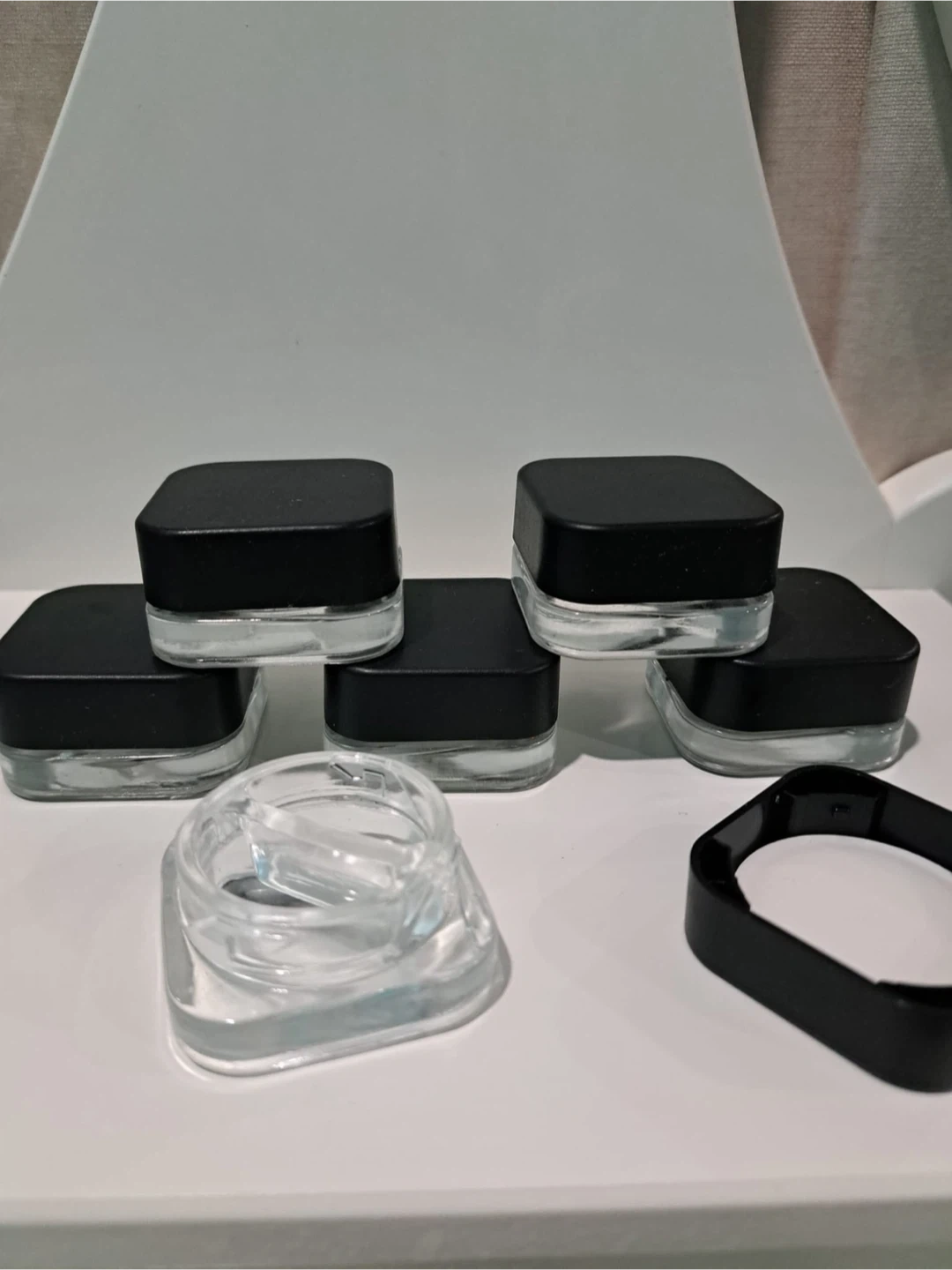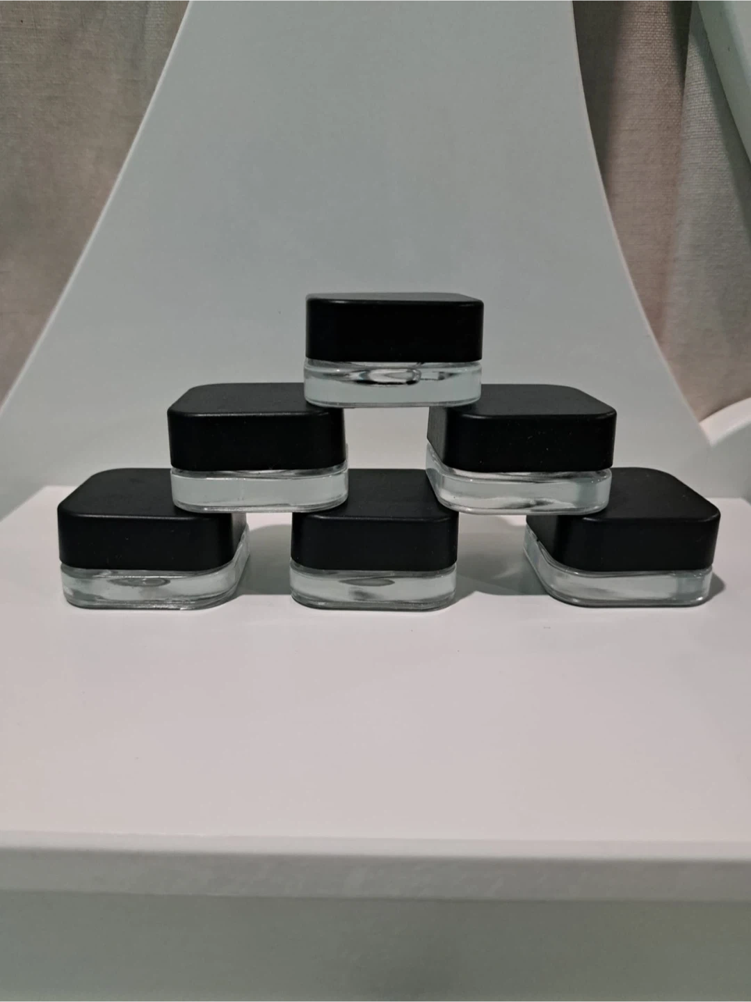 I have a set of small glass jars with black lids available. They're in great condition and perfect for storing small items or cosmetics. They are clear glass with black lids.